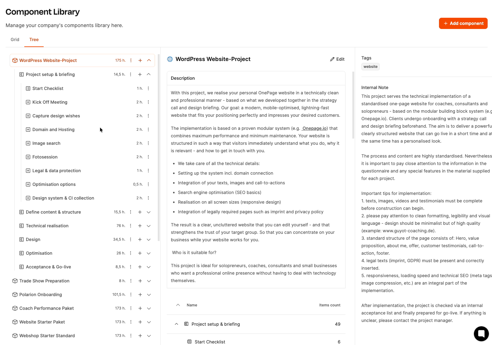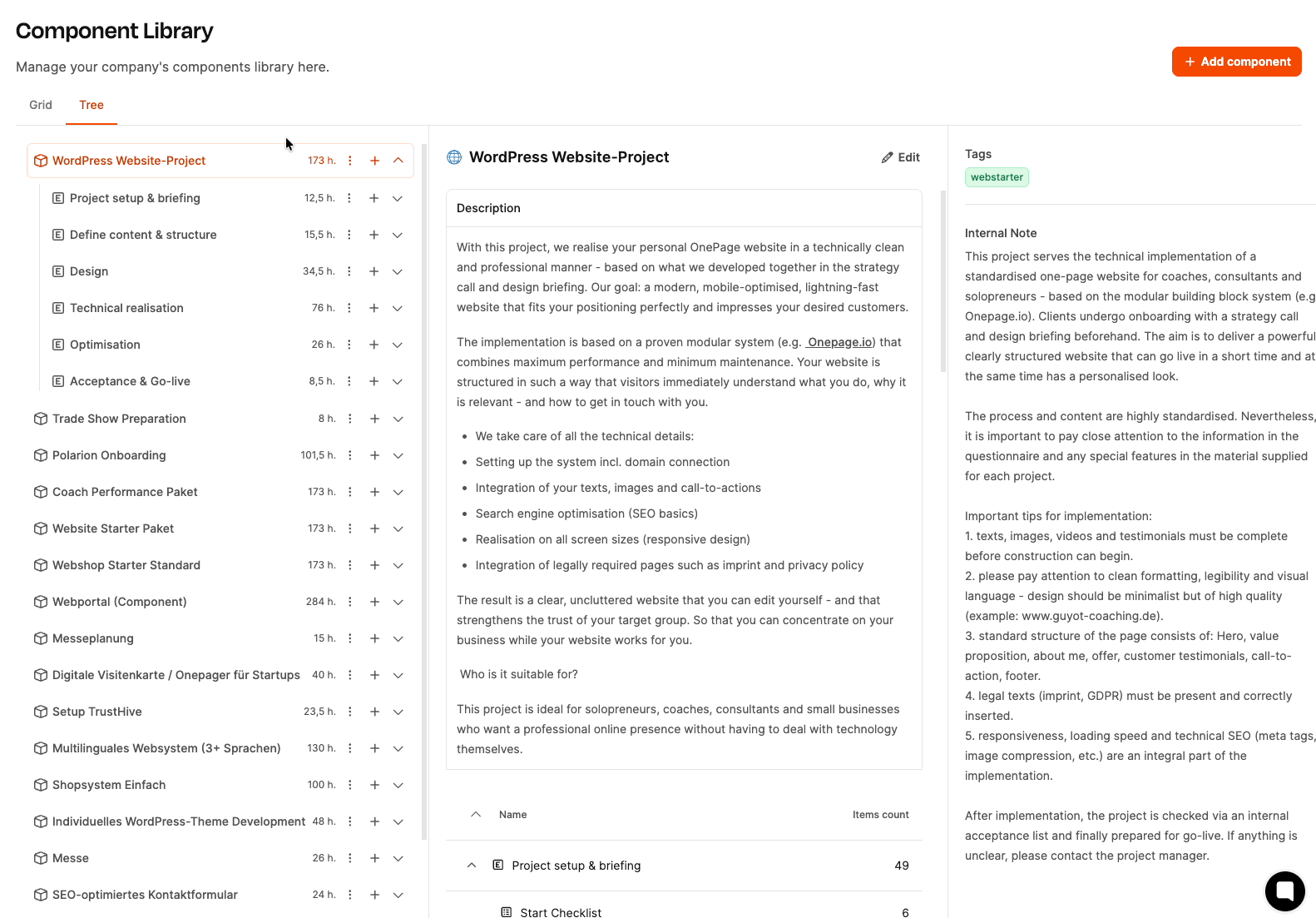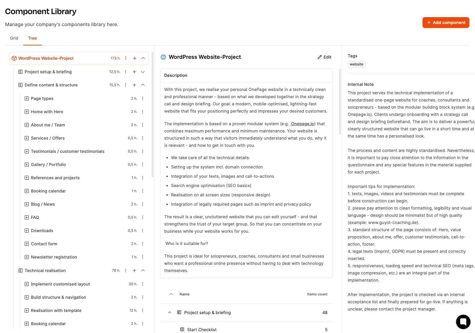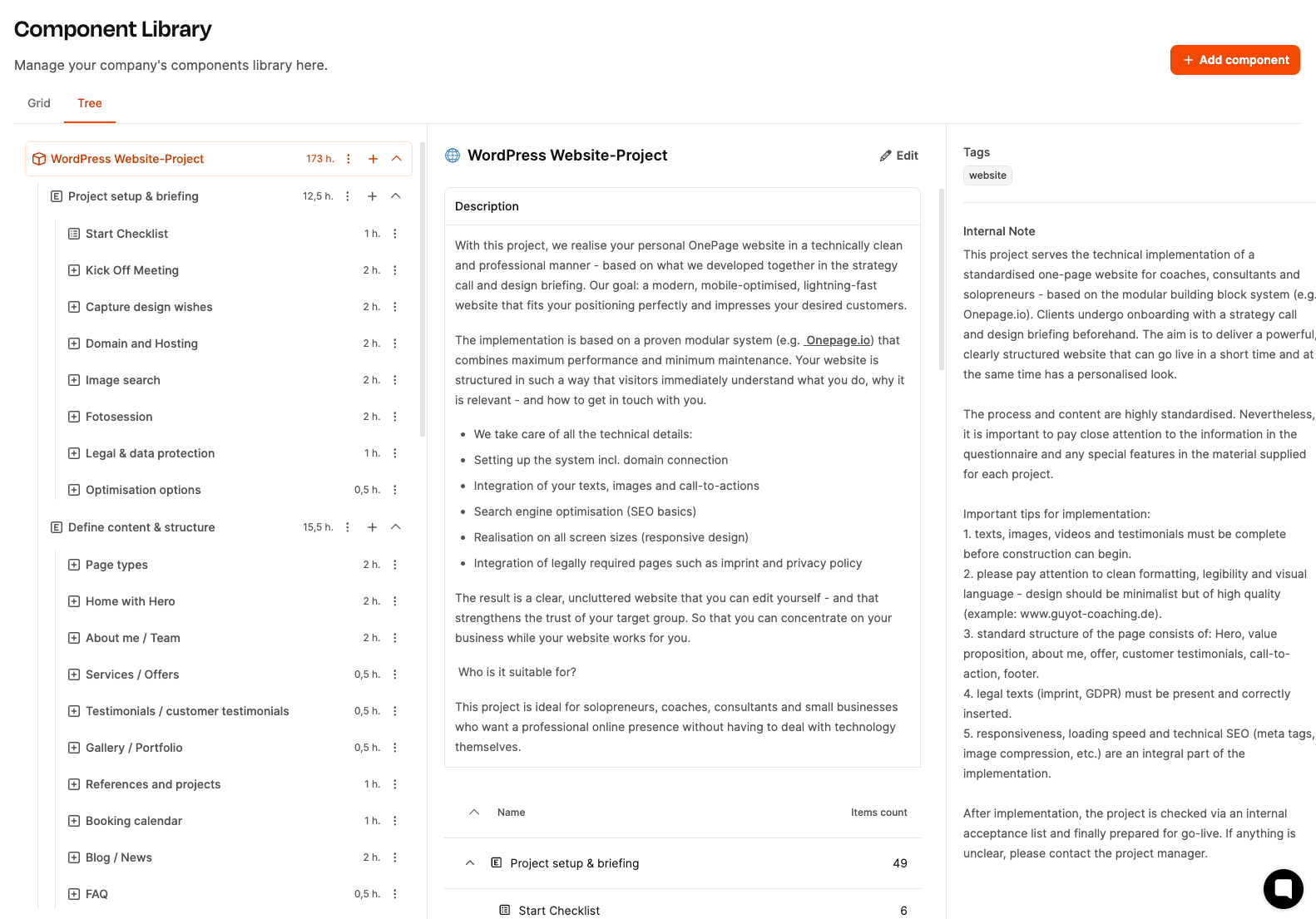 Interne Notiz: "Vorgehensweise: Diese Komponente wird zu Projektbeginn geladen und durch Beantwortung der Formularfragen an die spezifischen Kundenanforderungen angepasst. Bitte bei jedem Website-Projekt verwenden und nach Abschluss Lessons Learned dokumentieren."