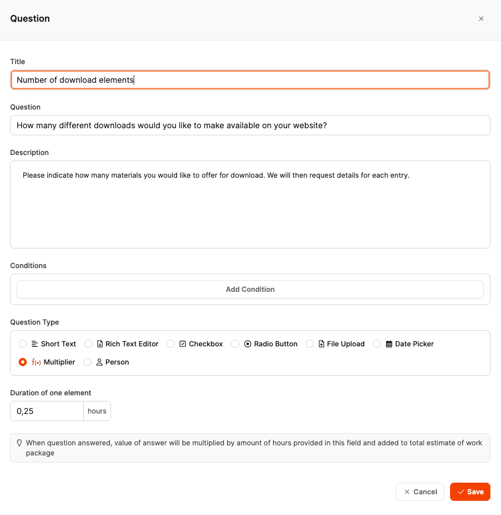 Daniel: "Ja, das geht. Wir können in den Bedingungen auch festlegen, dass sich der Mindestaufwand erhöht. Zum Beispiel bei der Frage 'Welche Performance-Anforderungen gibt es?' – wenn 'Sehr hoch' gewählt wird, können wir automatisch 5 Stunden zusätzlichen Aufwand für das Arbeitspaket 'Performance-Optimierung' hinzufügen."