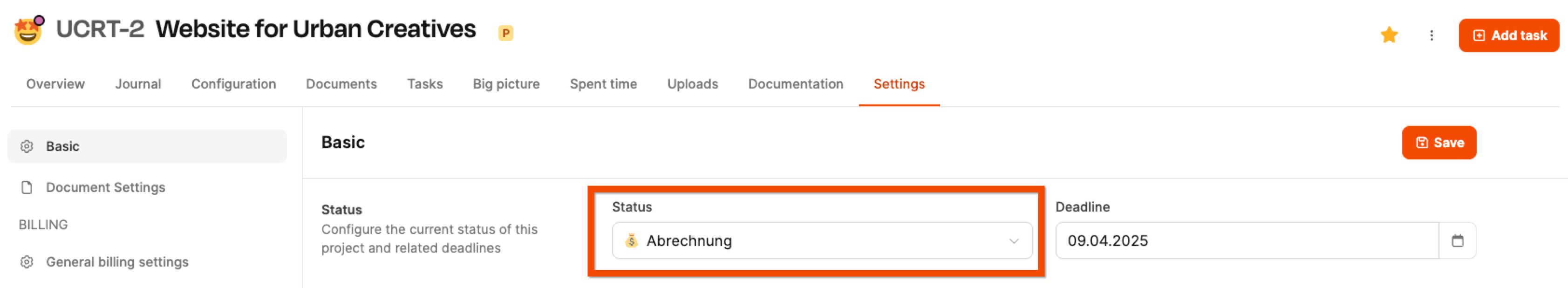 Setzen Sie den Projektstatus auf „Abrechnen“.