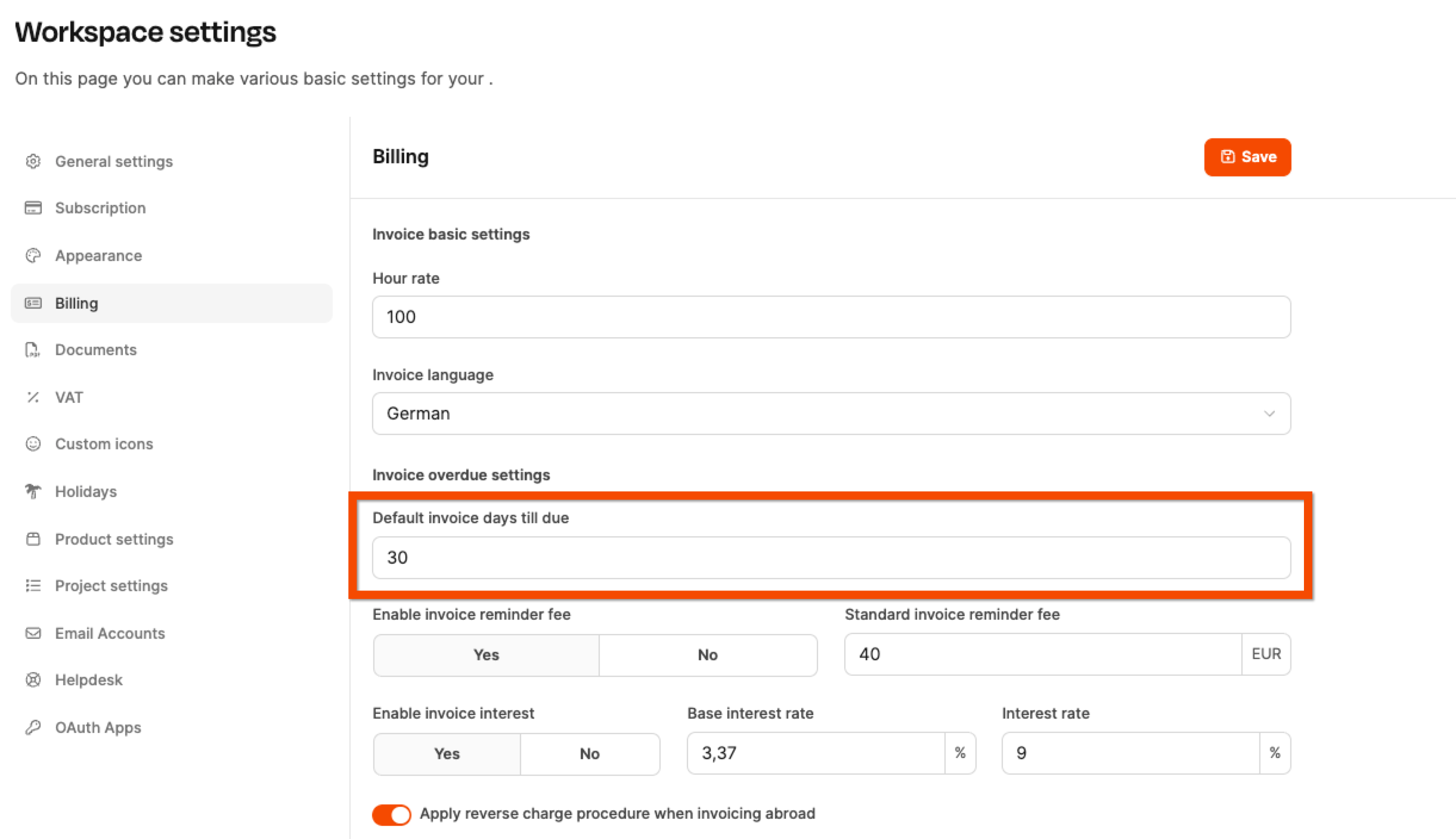 Das Zahlungsziel wird standardmäßig bei Administration → Workspace-Einstellungen → Rechnungs-Einstellungen festgelegt (z. B. 30 Tage).