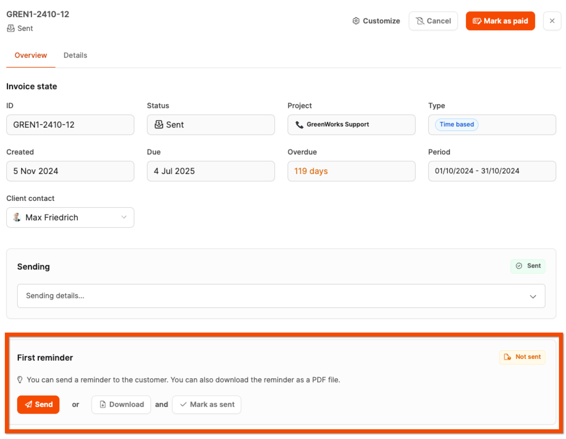Sobald eine Rechnung in Leadtime versendet wurde – per E-Mail oder manuell als „gesendet“ markiert – beginnt das definierte Zahlungsziel zu laufen. Wird dieses überschritten, erscheint die Rechnung automatisch im Reiter „Überfällig“ des Bereichs Forderungen. Hier verwalten Sie offene Forderungen, versenden Mahnungen und behalten alle Fristen im Blick.