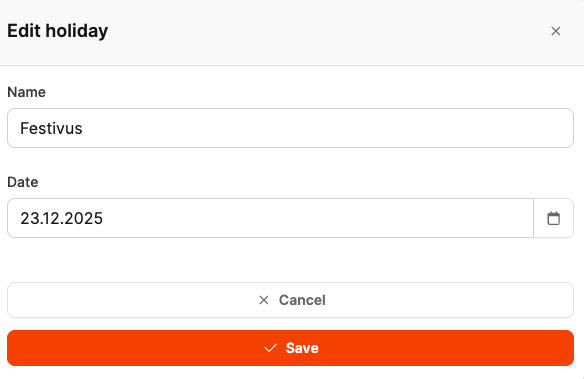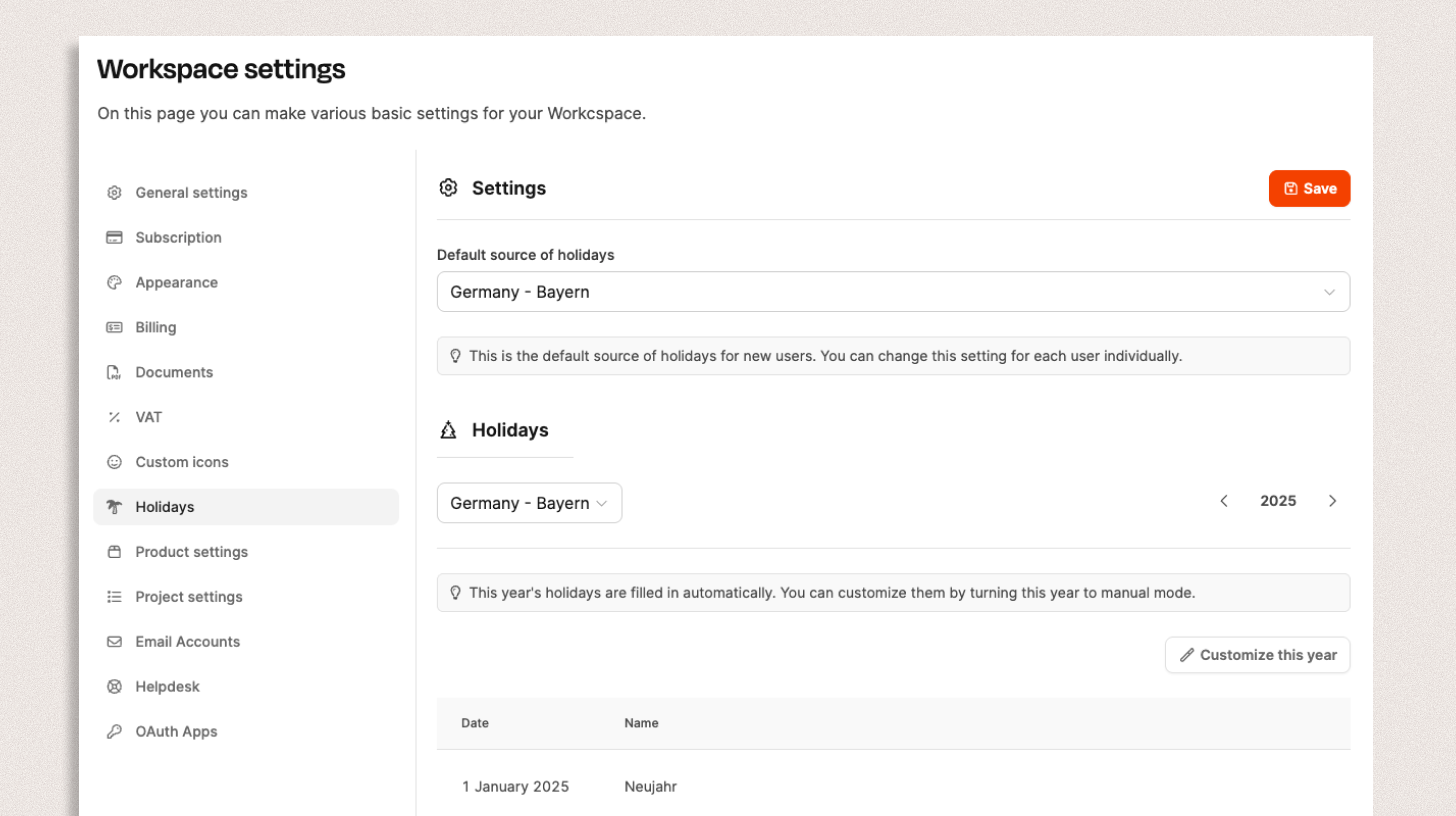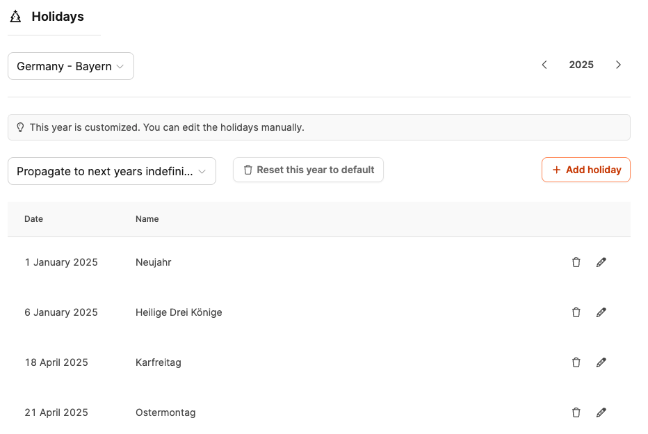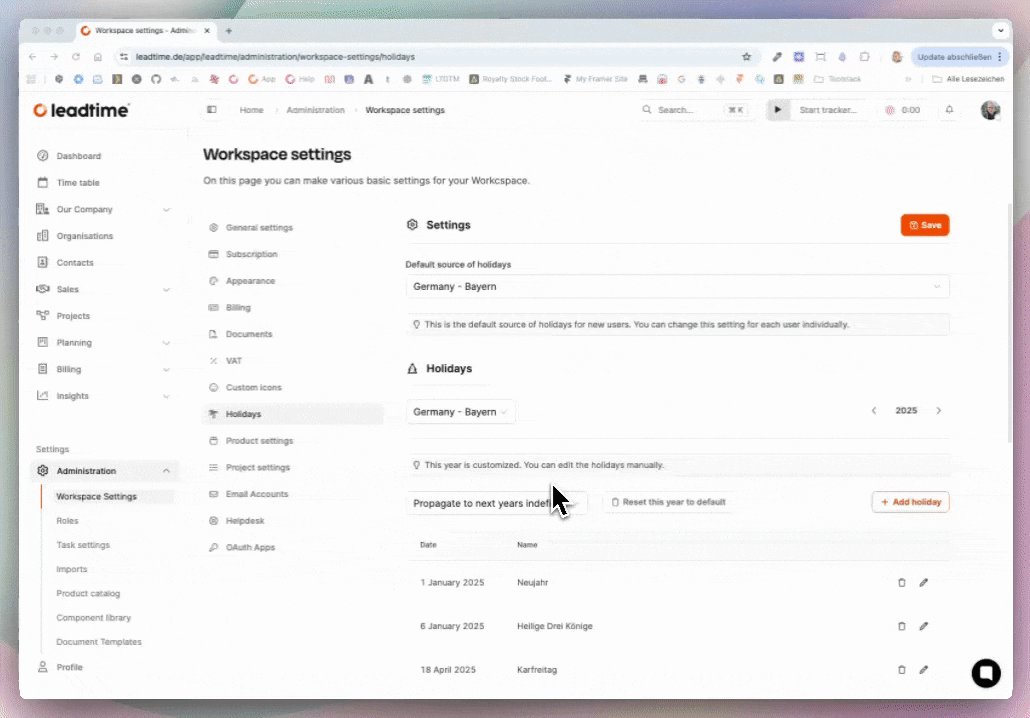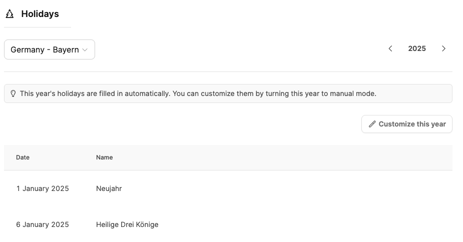 Zu finden unter Administration → Workspace Einstellungen → Feiertage