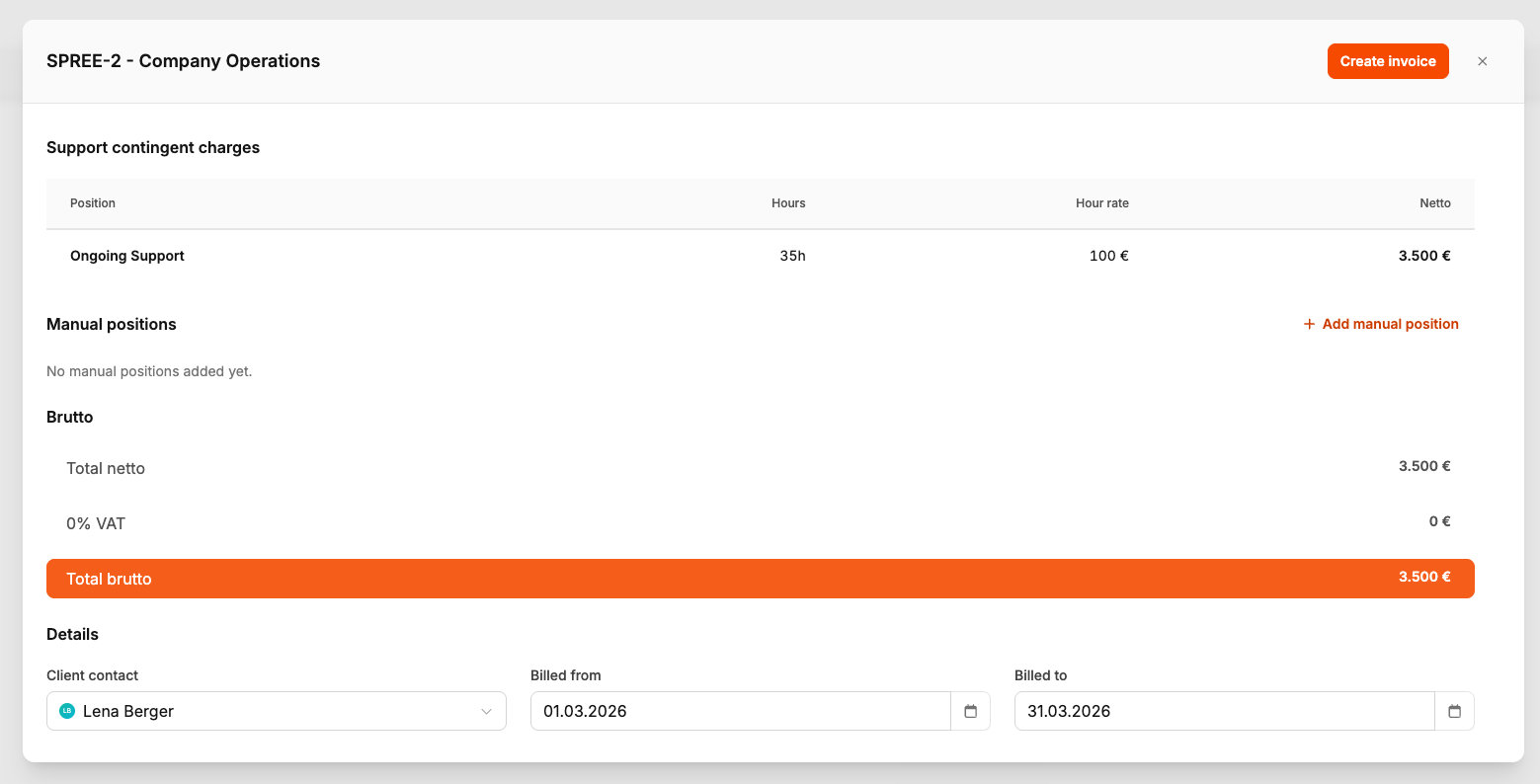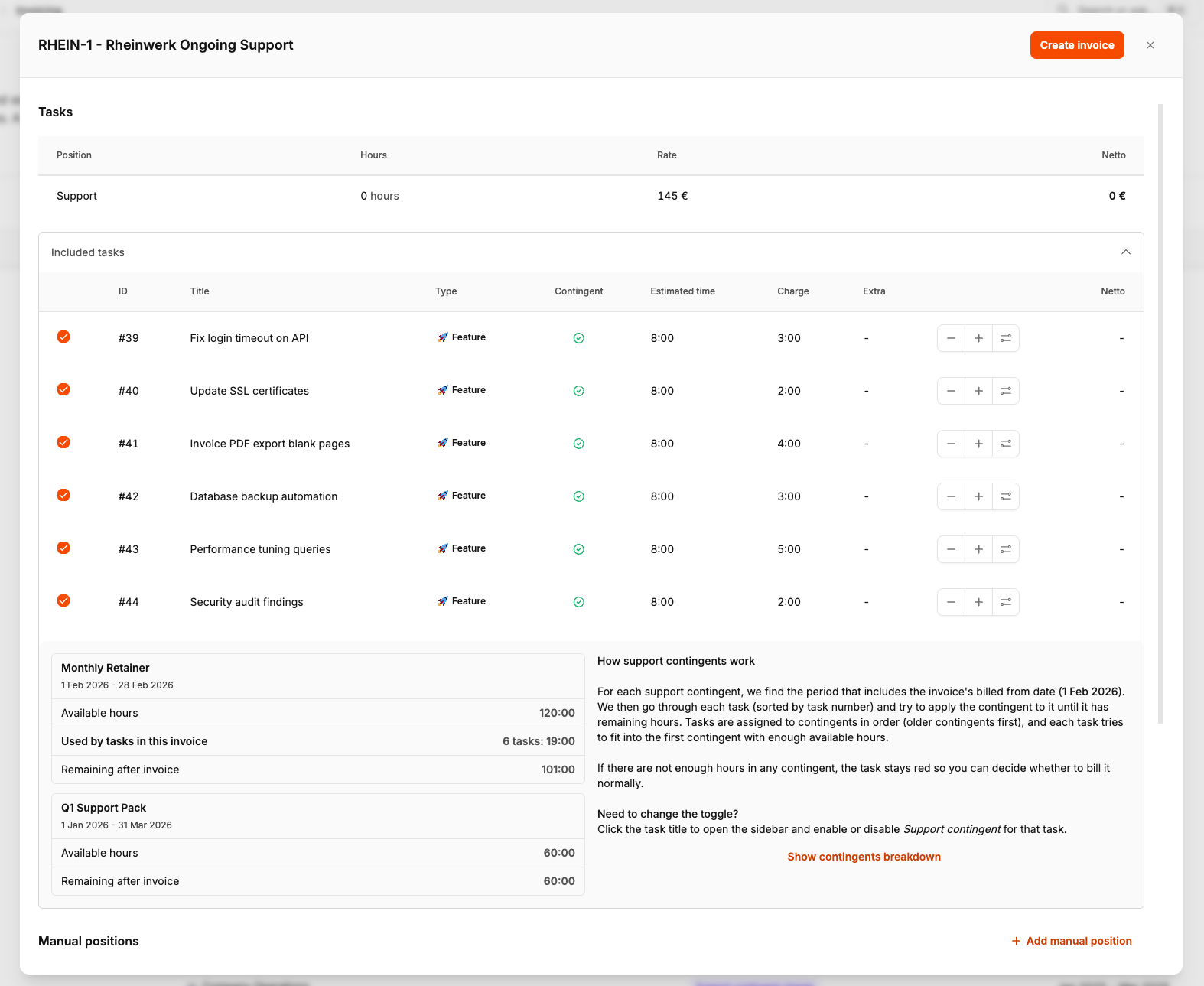 Wenn du in Abrechnung → Rechnungen eine Rechnung für ein Support-Projekt erstellst, kombiniert das System Retainer-Gebühren und Task-Stunden zu einer gemischten Rechnung. Tasks, die Kontingenten zugewiesen sind, erscheinen nicht als separate Positionen — sie verbrauchen Stunden aus dem Kontingent.