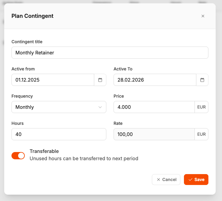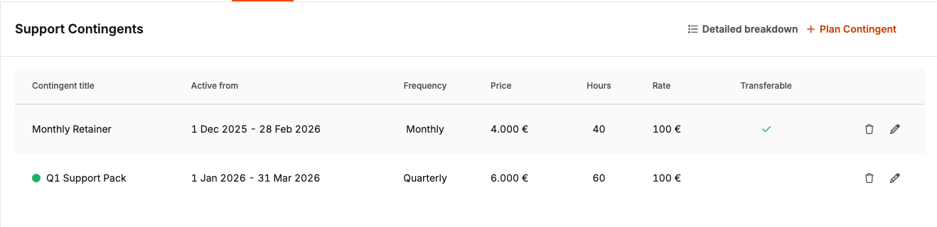 Support-Kontingente sind Retainer-Pläne, die zugeteilte Stunden und Preise für Support-Projekte definieren. Du kannst mehrere Kontingente pro Projekt anlegen — z.B. ein monatliches Retainer plus ein quartalsweises Support-Paket — und sie können sich überschneiden. Beim Erstellen von Rechnungen werden abgeschlossene Tasks mit gebuchter Zeit automatisch Kontingenten zugewiesen und verbrauchen Stunden aus dem Retainer, statt als separate Positionen abgerechnet zu werden.