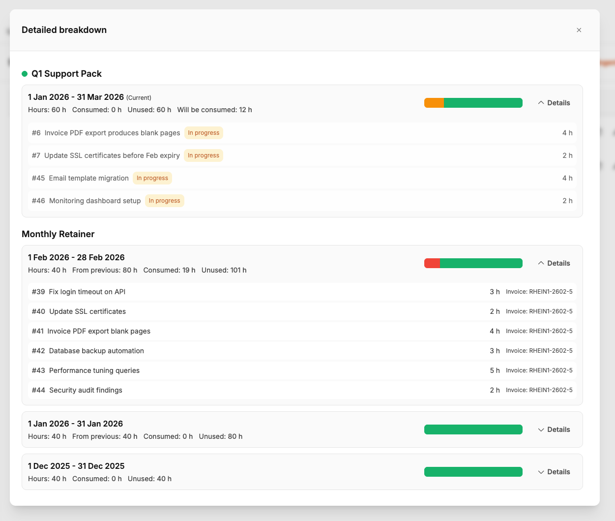 Support-Kontingente eignen sich für laufende Support-Verträge, Retainer-Abrechnung und vorab bezahlte Stundenpakete. Sie geben dir einen klaren Überblick, wie viele Stunden pro Periode übrig sind und welche Tasks sie verbraucht haben.
