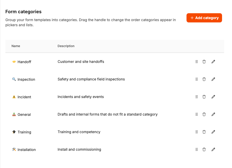 Kategorien strukturieren Vorlagen—ähnlich wie Produktkategorien. Jede Vorlage gehört zu genau einer Kategorie.