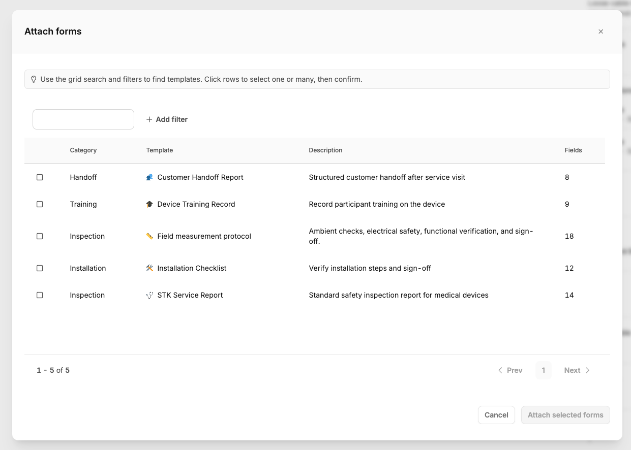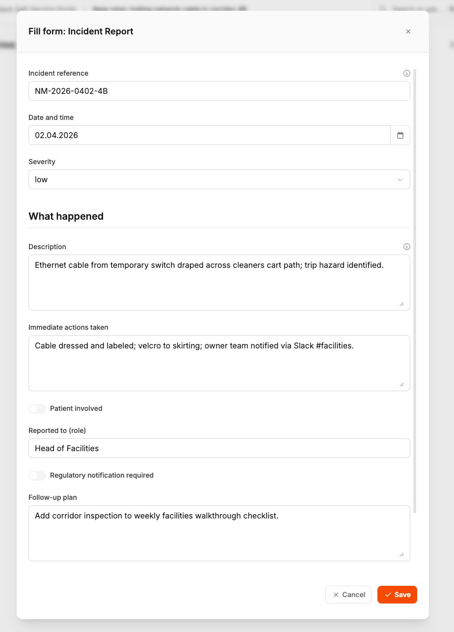 Am Task sind Formular-Instanzen lebende Kopien deiner Bibliotheks-Vorlagen. Nutze sie, wenn neben der Beschreibung eine Checkliste, Unterschrift oder strukturierte Nachweise nötig sind. Du steuerst Instanzen über das Forms-Panel in der Sidebar und bearbeitest dieselben Inhalte in einklappbaren Blöcken in der Hauptspalte—je nachdem, was für dich schneller ist.