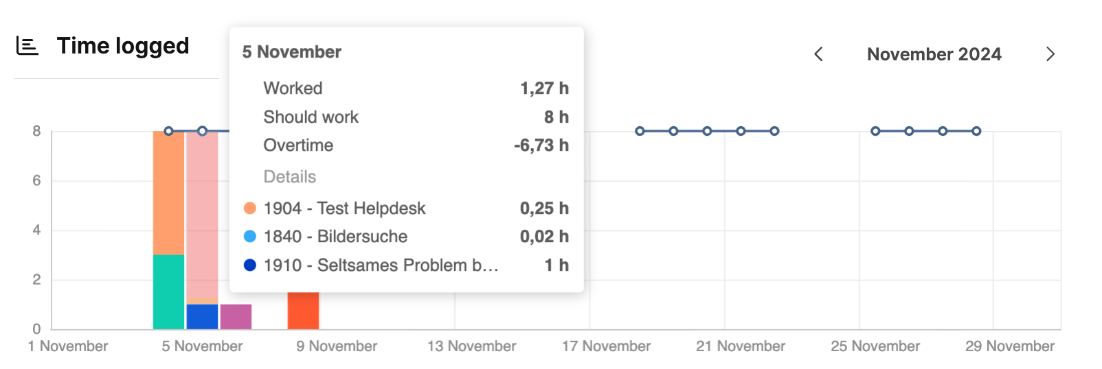 Time Logged: Grafische Darstellung Ihrer geleisteten Arbeitsstunden im Zeitverlauf.