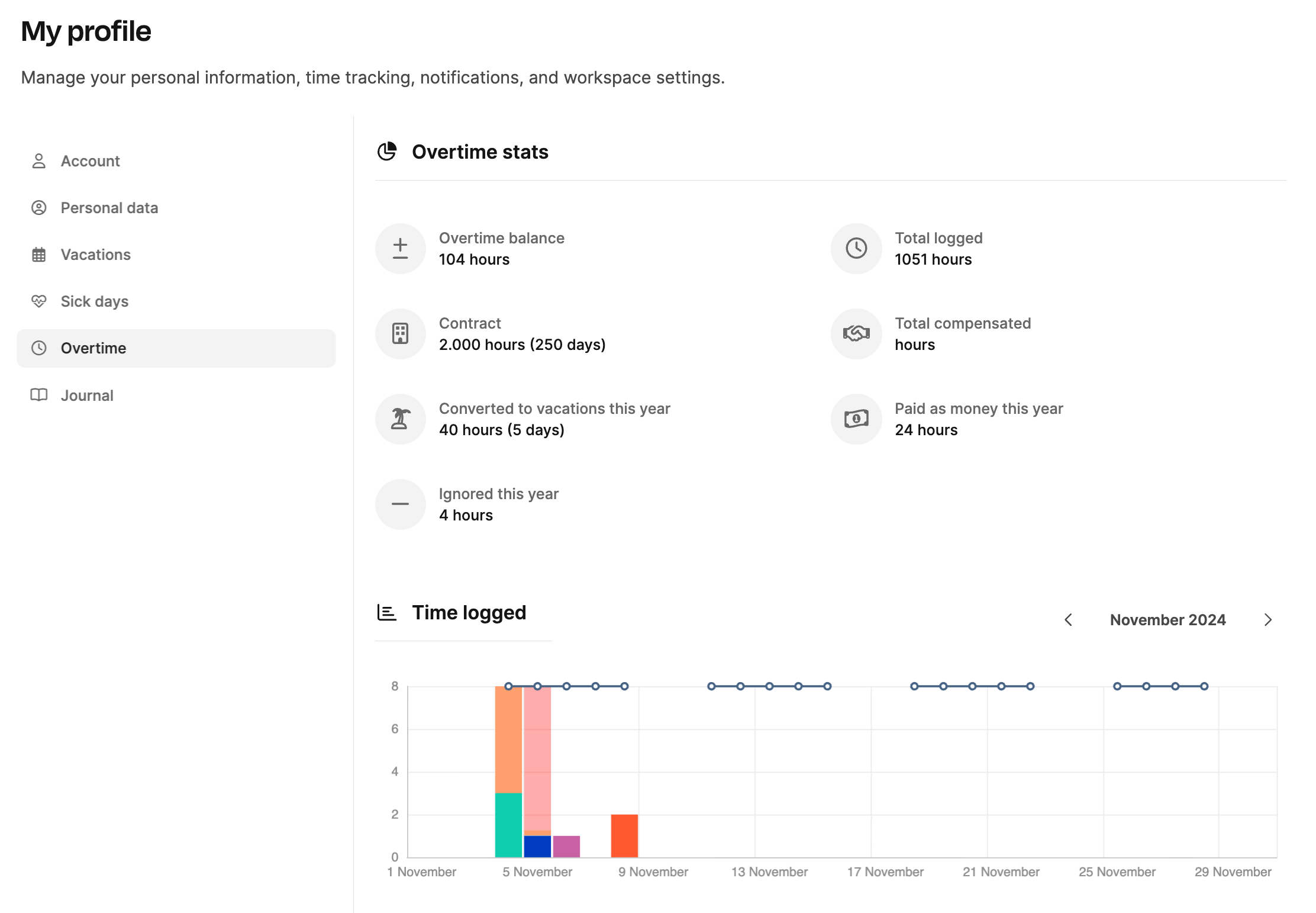 Im Reiter Mein Profil → Überstunden sehen Sie alle relevanten Informationen zu Ihrem Arbeitszeitkonto:
