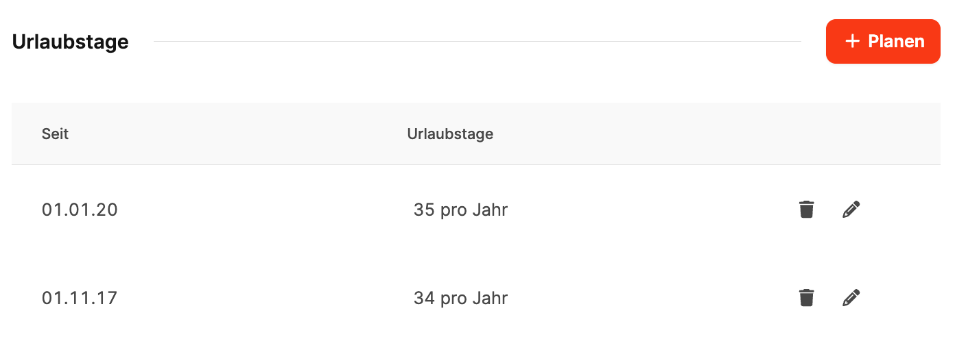 Über den Button + Planen lassen sich neue Vereinbarungen zum Urlaubskonto des Mitarbeiters anlegen.