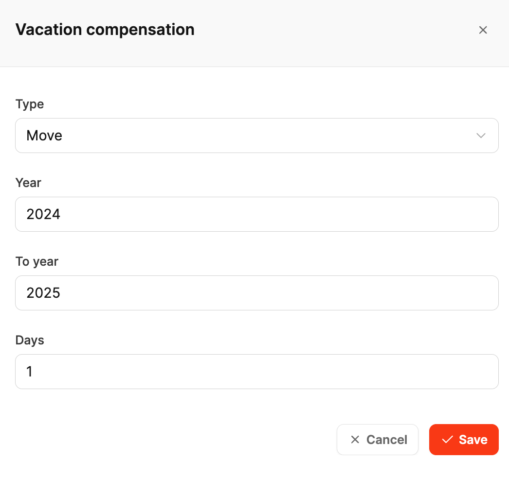 To year: (nur bei Verschiebung) Zieljahr, in das die Urlaubstage übertragen werden sollen