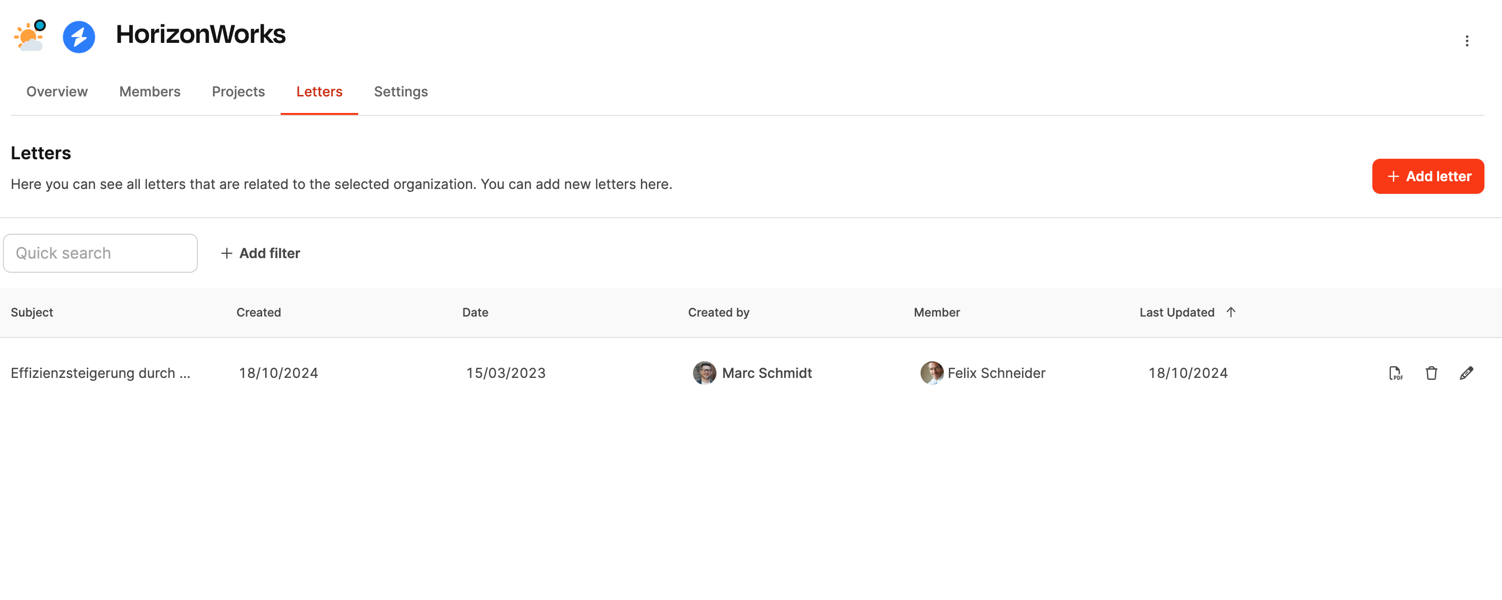 Der Bereich zeigt eine Übersicht aller Briefe, die einer Organisation zugeordnet sind. Jedes Schreiben bleibt an der richtigen Stelle dokumentiert und kann jederzeit eingesehen, bearbeitet oder erneut heruntergeladen werden.