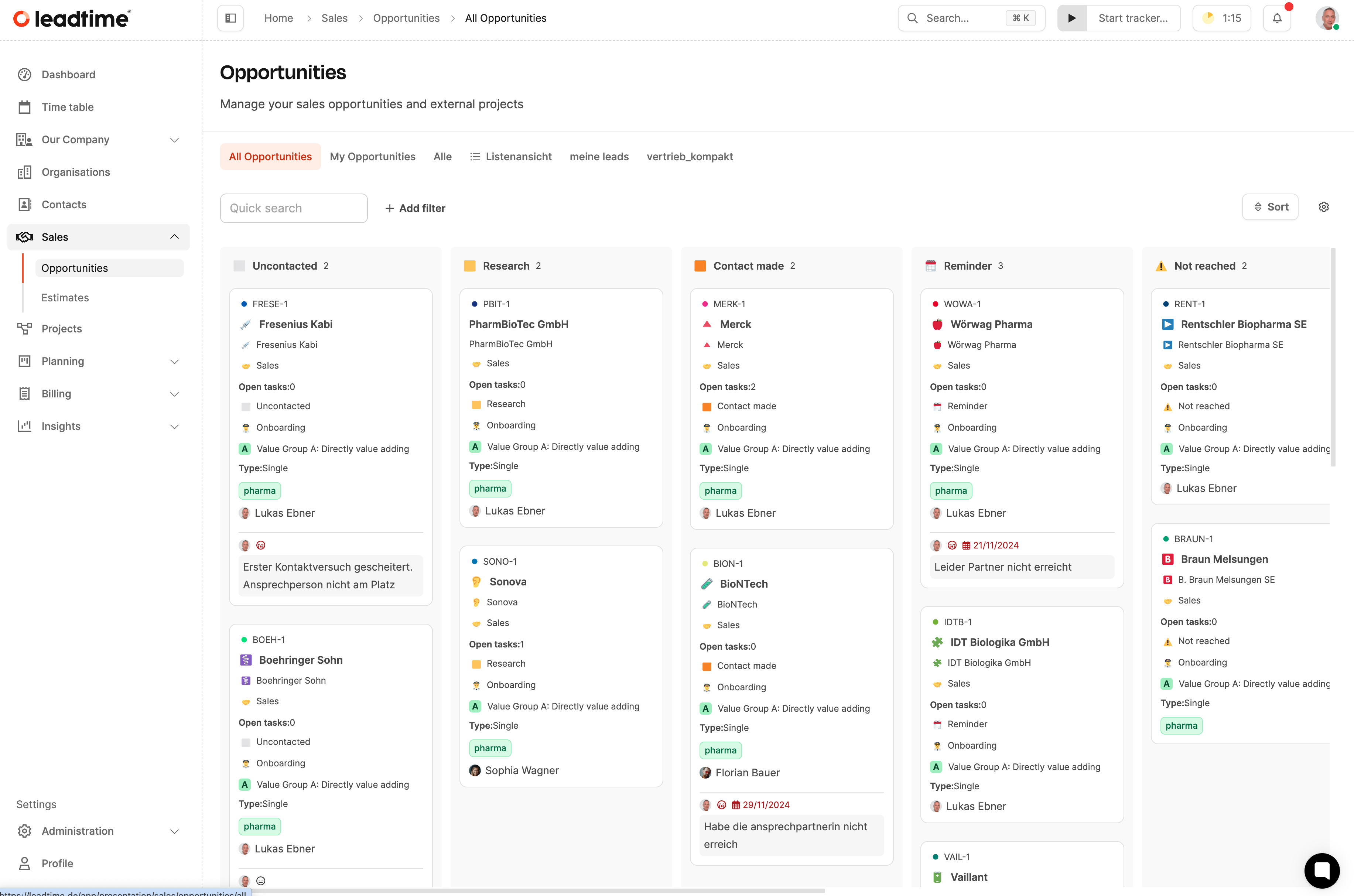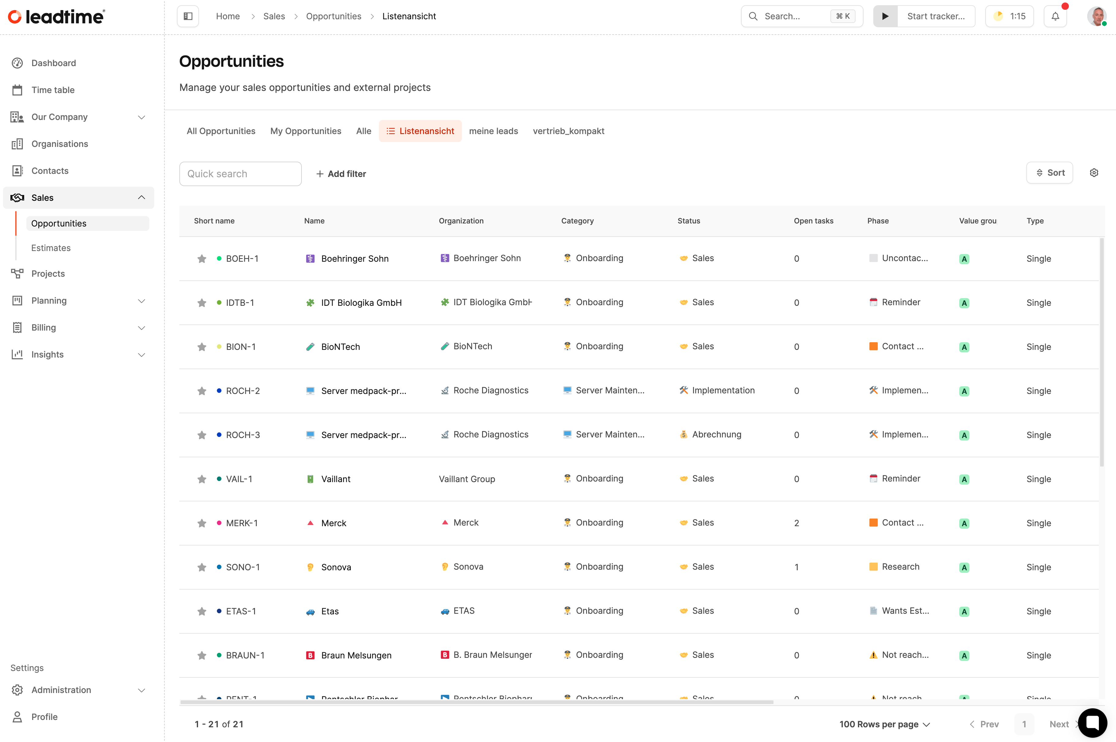 In der Ansicht Opportunities werden alle Vertriebsprojekte zentral dargestellt und können nach Phase, Status, Verantwortlichem oder Organisation gruppiert und gefiltert werden.