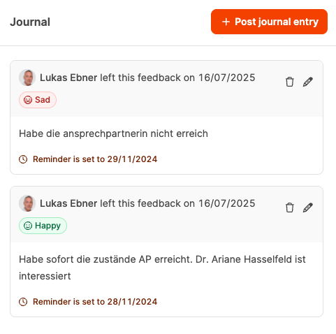 Das Journal ist das Kommunikations- und Verlaufsprotokoll einer Opportunity. Hier werden alle Aktivitäten, Rückmeldungen und Interaktionen mit dem potenziellen Kunden dokumentiert.