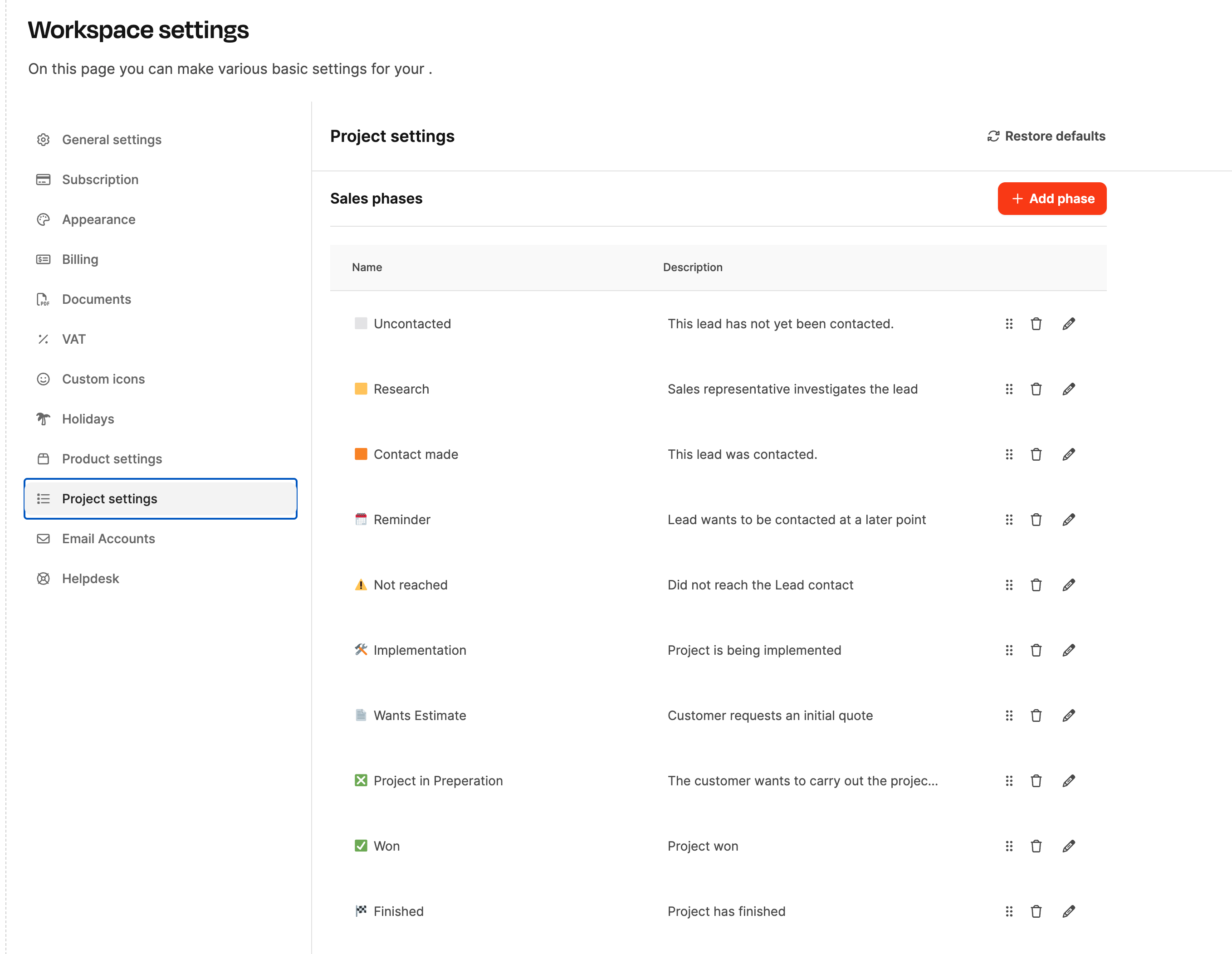 Vertriebsphasen können hier definiert werden: Projekteinstellungen