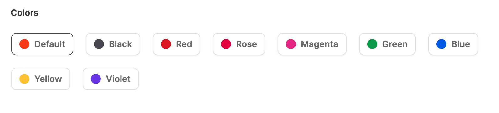 Default, Black, Red, Pink, Magenta, Green, Blue, Yellow, Purple.