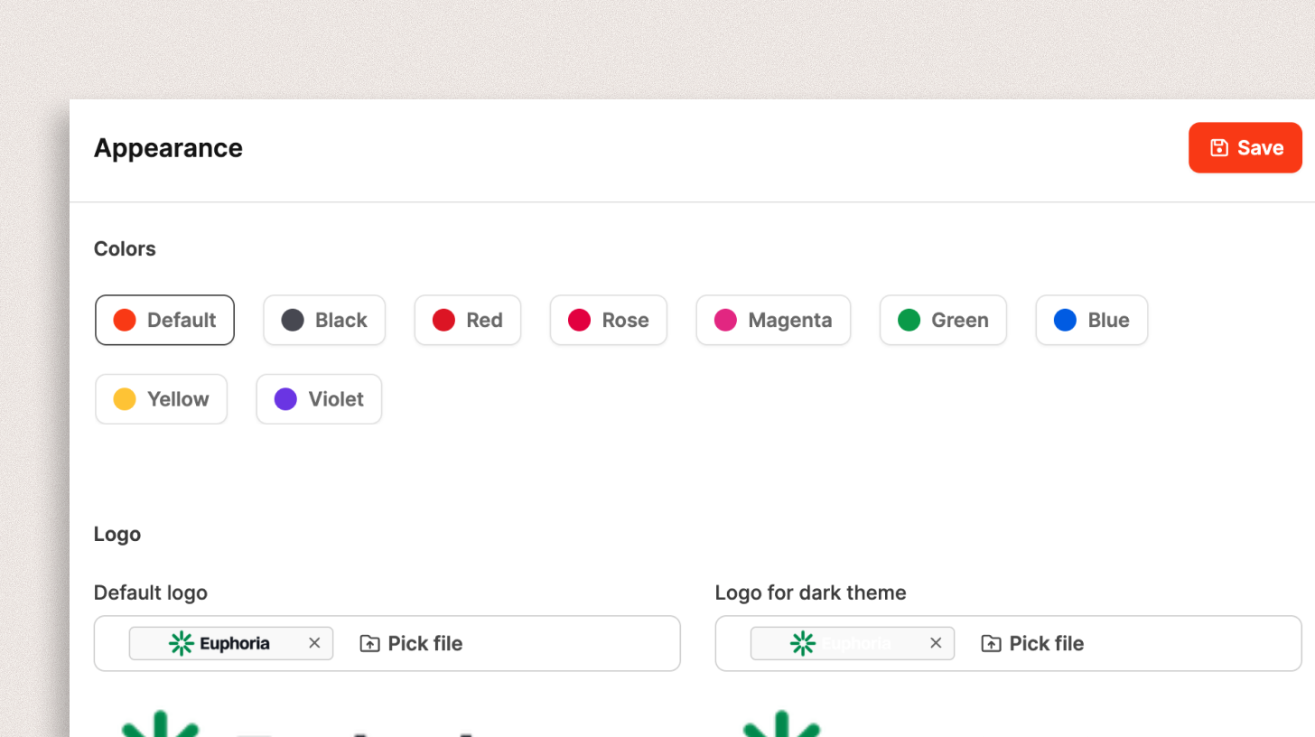 In this section, you can tailor the look of your workspace to fit your company branding. That includes color schemes and logo options for light and dark themes.