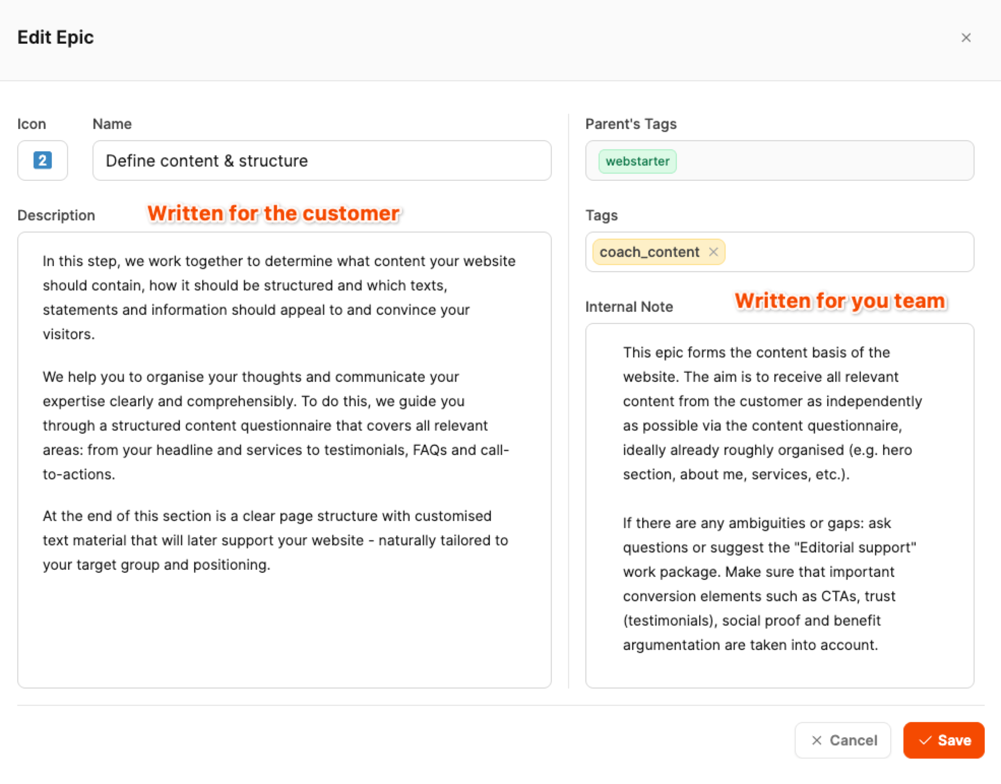 This example shows how description texts and internal notes speak to different audiences — like the customer on one hand, and your own team on the other.
