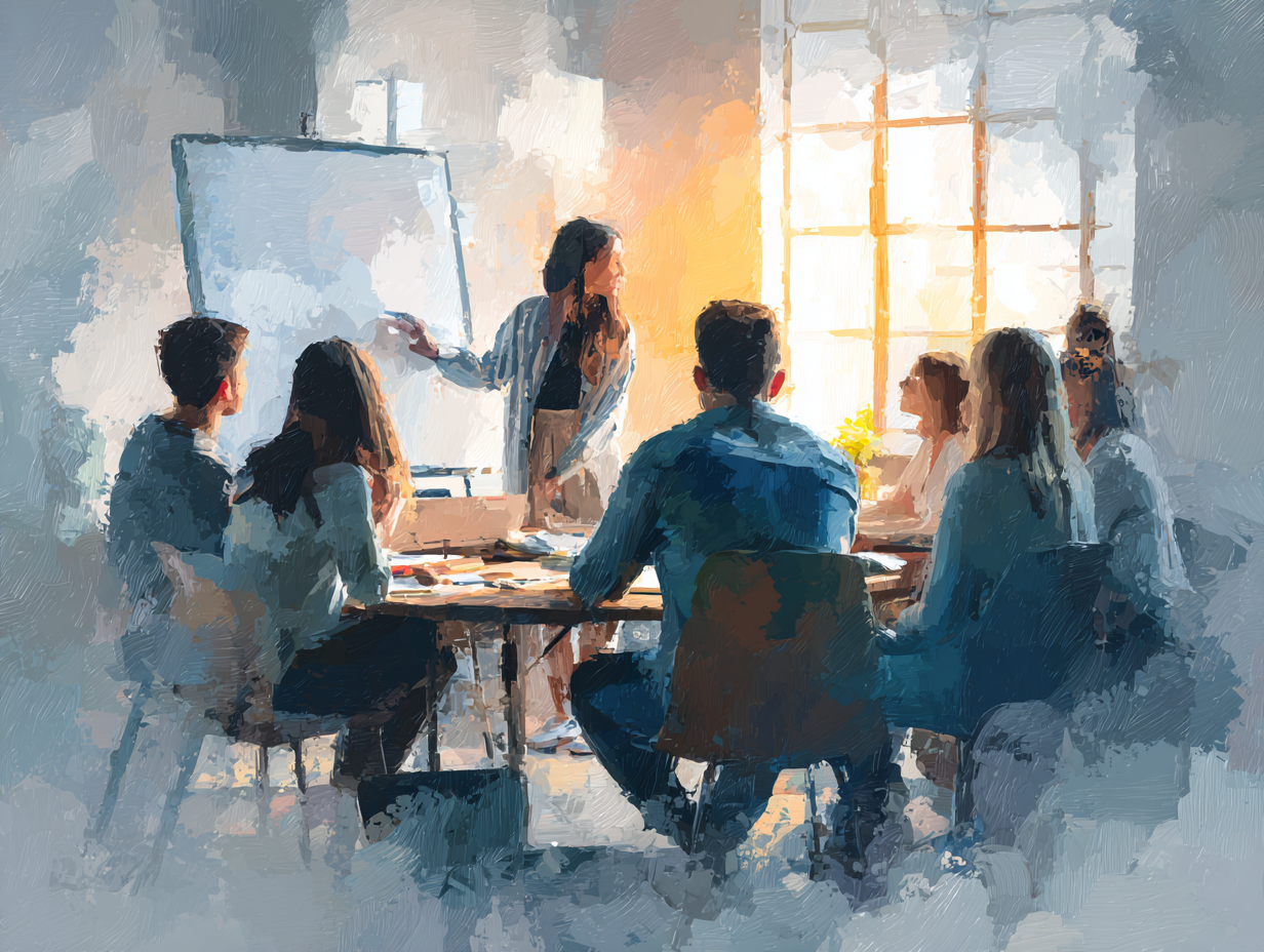 Sarah Bergmann gathered the team in the meeting room. The team is sitting at the big meeting table. Sarah Bergmann is leading the discussion, Michael König has Leadtime open on the screen, which is projected onto the large monitor. Coffee cups are on the table, notepads are ready.