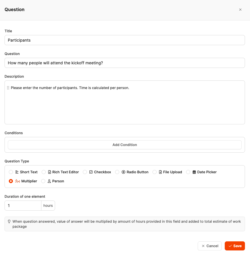 Example: The work package "Create custom offer template" should only be visible if the question "Does the customer need custom offer templates?" was answered with "Yes" in the kickoff meeting.