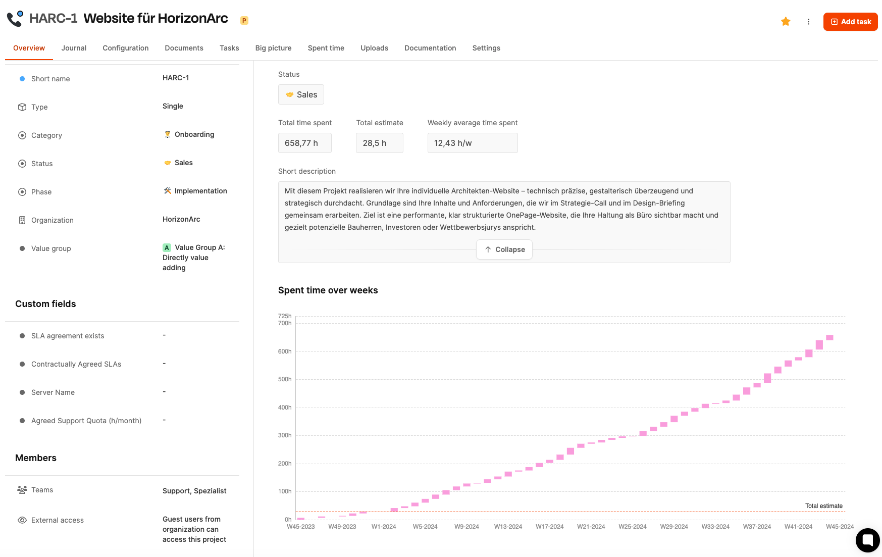 The page is built with two columns and has several info sections showing both operational and admin aspects of the project.