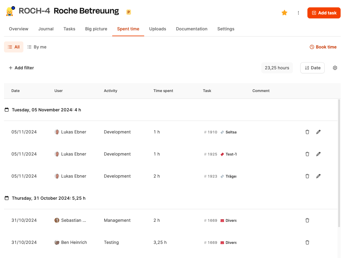 After opening the tab, all project time entries show up in a table view. By default, entries are grouped by date. For each day, the bookings are totaled and displayed.
