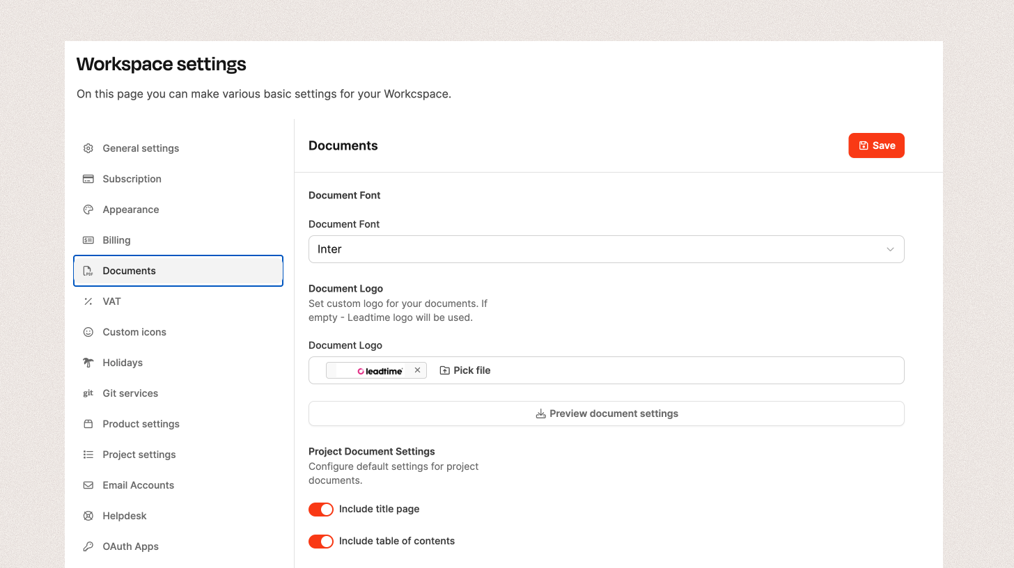 Here you set the look and basic behavior of all documents generated by Leadtime. This includes font, logo, and default options for project documents like quotes or specifications.