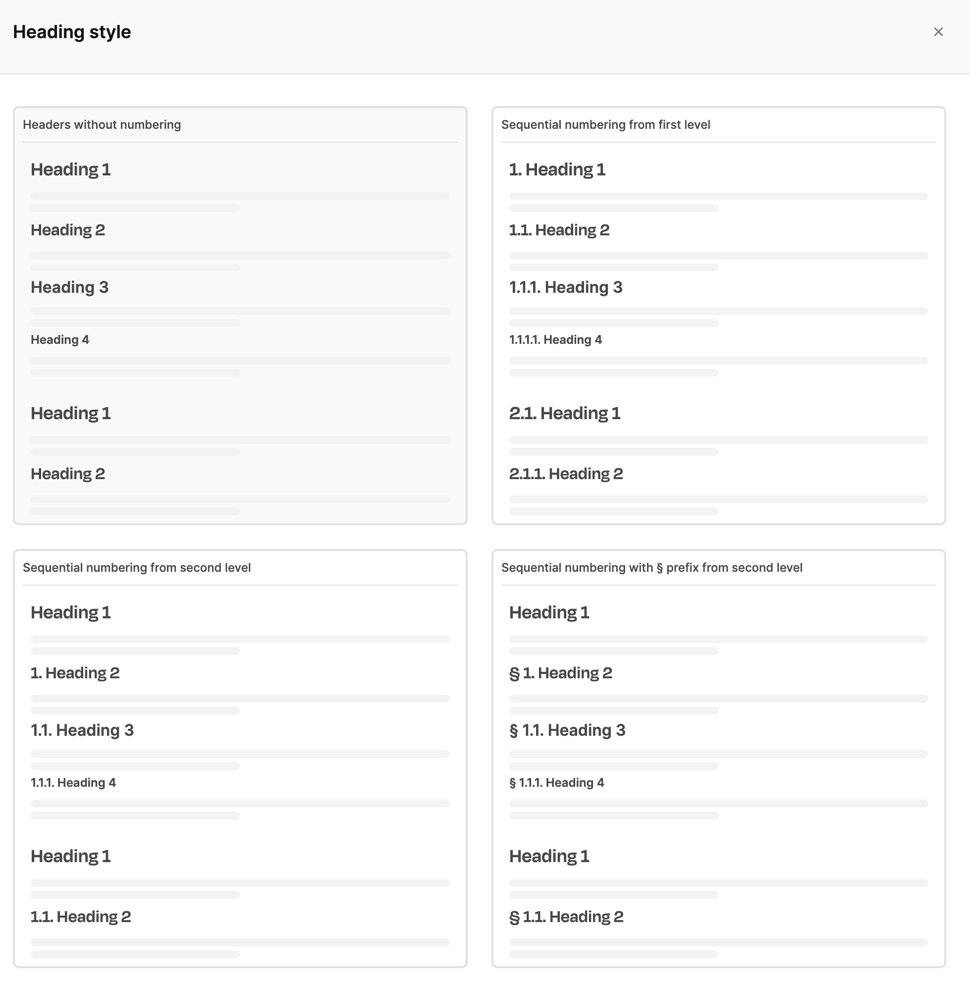 With this option, you control how headings are formatted and numbered in document templates. This is especially relevant for contract or project documents, where a clear and traceable structure is needed.