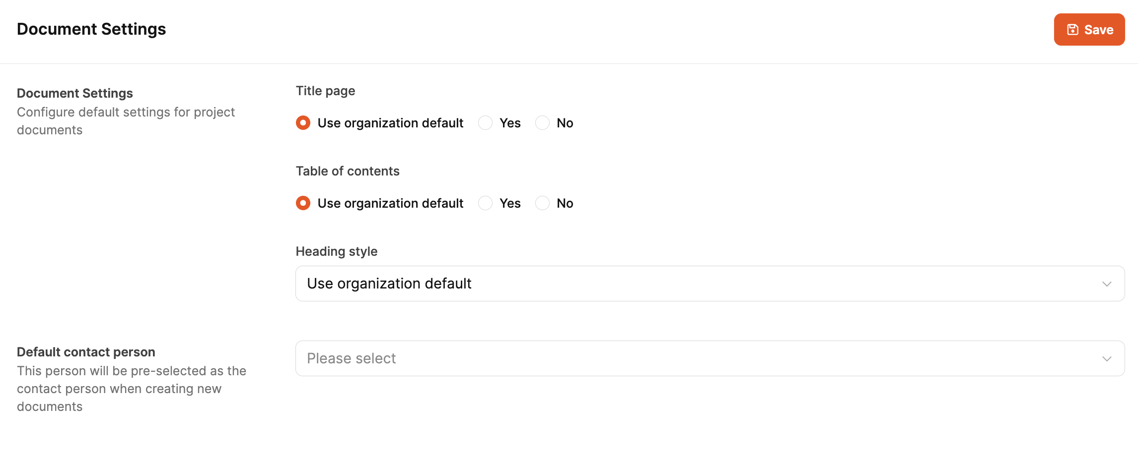 You’ll find this area in a project under Projects → [Select project] → Settings tab → Document settings. Here you set up project-specific default options for automatically generated documents. These settings can override the organizational unit defaults if needed and affect the format, structure, and contact info in proposals, contracts, requirement specs, and other generated documents.
