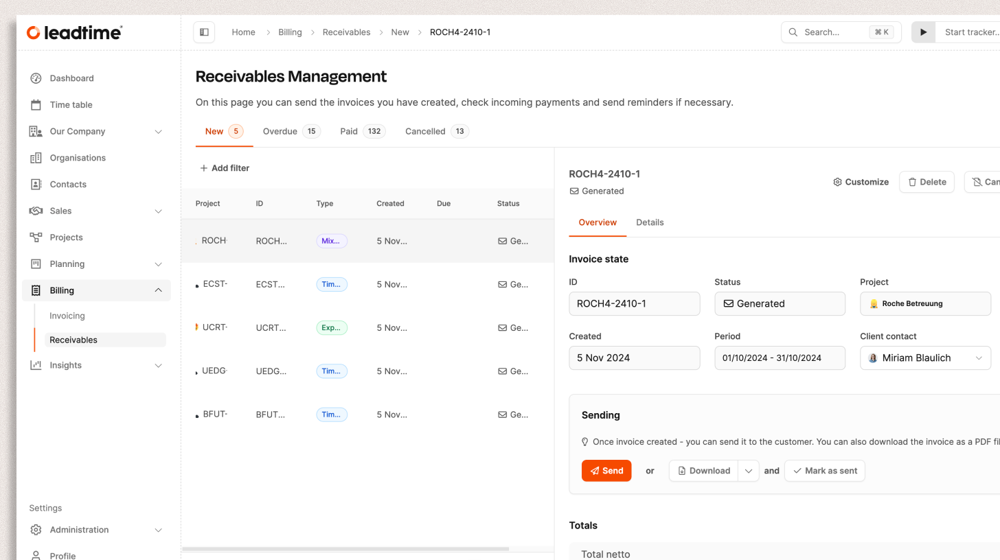 In the Invoicing and Sending step, the system creates an official invoice document with sequential numbering. You can send it straight from Leadtime. In this step, the Leadtime service fee is also triggered, which is applied to each invoice created.
