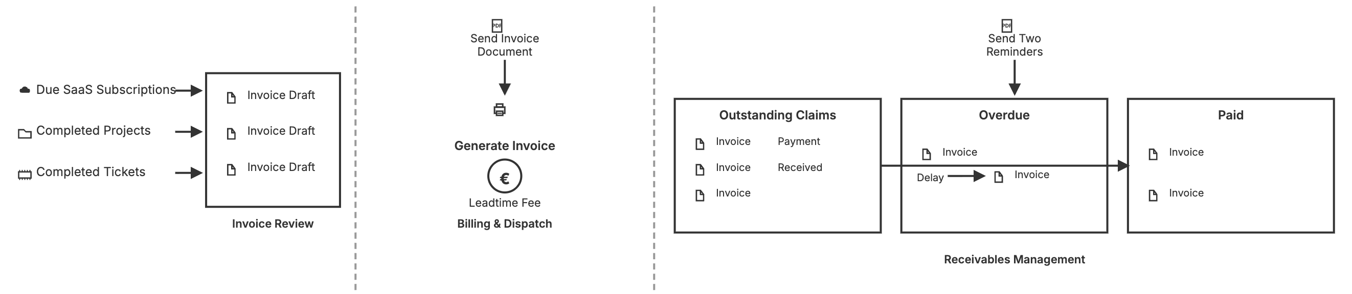Leadtime turns day-to-day work into billable items. Services are created during daily business and then handed over to the billing process. This includes time from tickets, recurring income from subscriptions, and amounts from projects. As soon as something becomes billable, the system automatically creates an invoice draft in invoice review. After approval, invoice documents can be sent out straight away. Overdue invoices are automatically flagged and can be dunned.