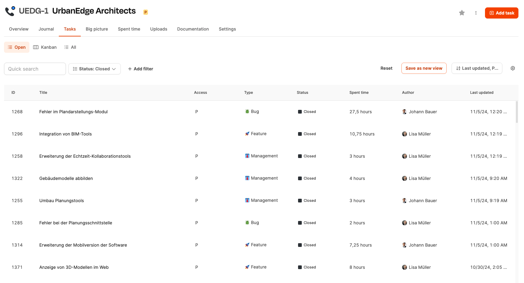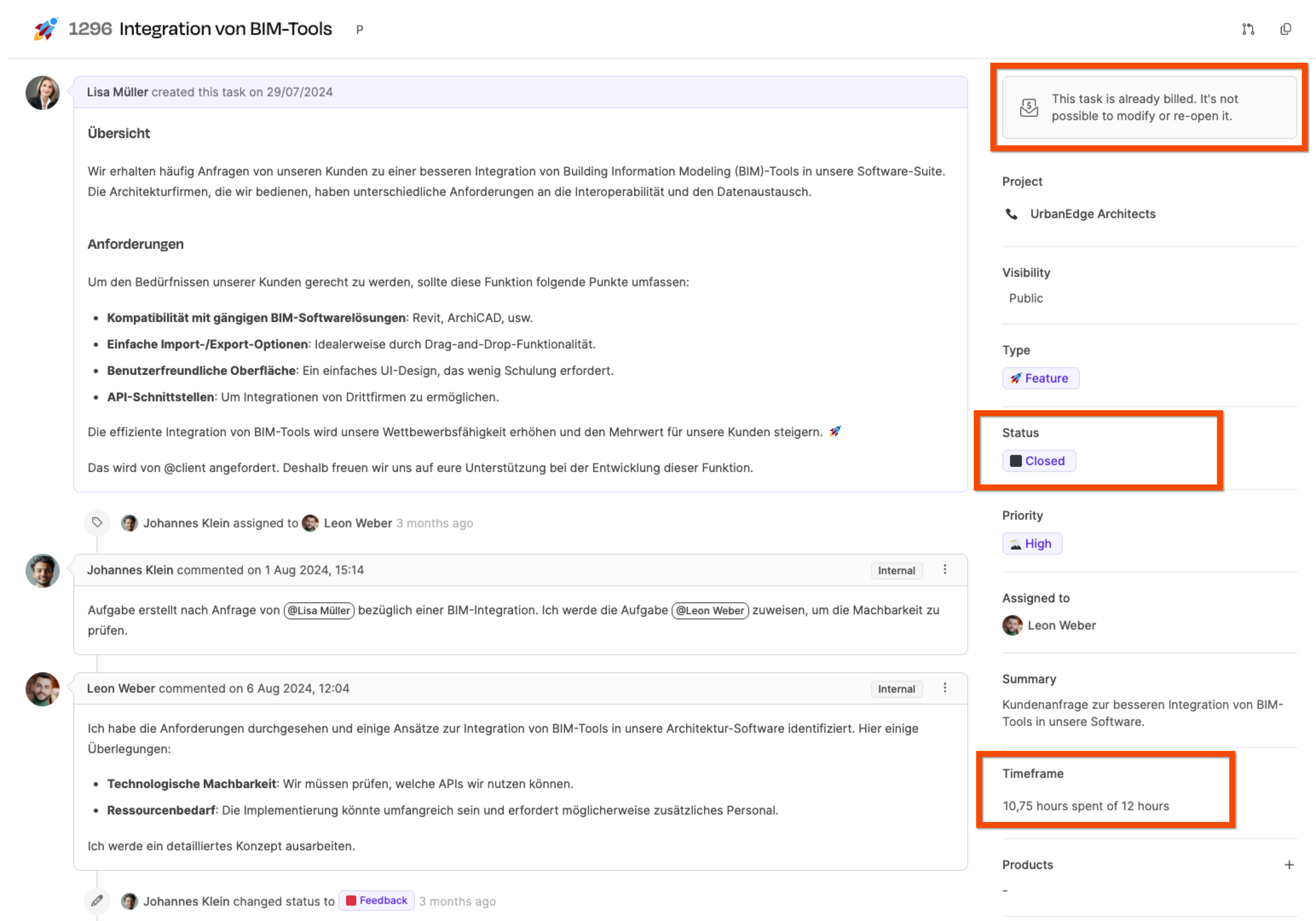 In the detail view, you can change the title of a ticket to make it easier for the customer to understand. For example, the title Integration of BIM tools can be expanded with extra details that help the customer clearly identify the task.