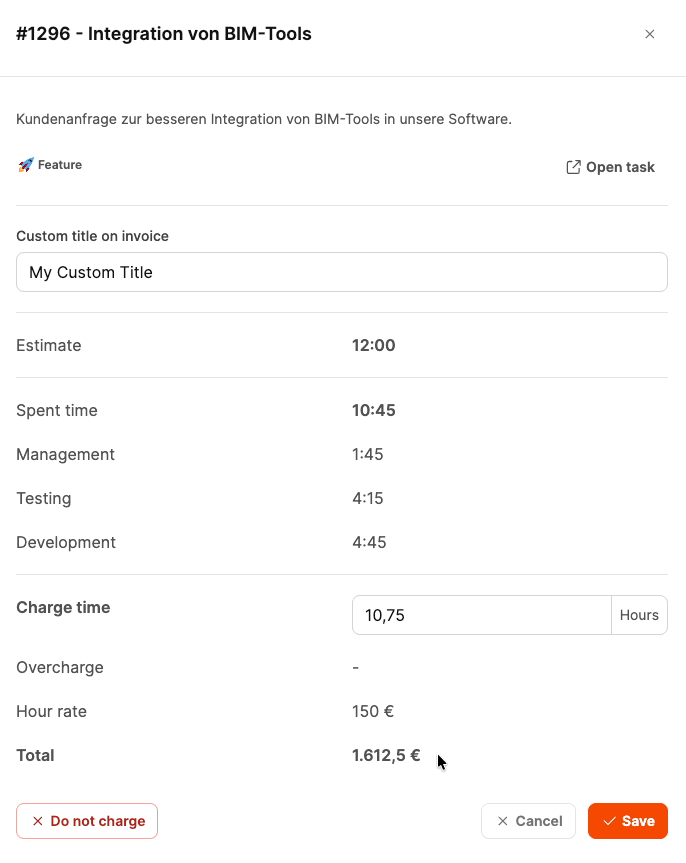 Increase to the estimated time: For example, in this case, it might make sense to bill the originally planned 12 hours instead of the actually worked 10.75 hours, if that's what was agreed with the customer.