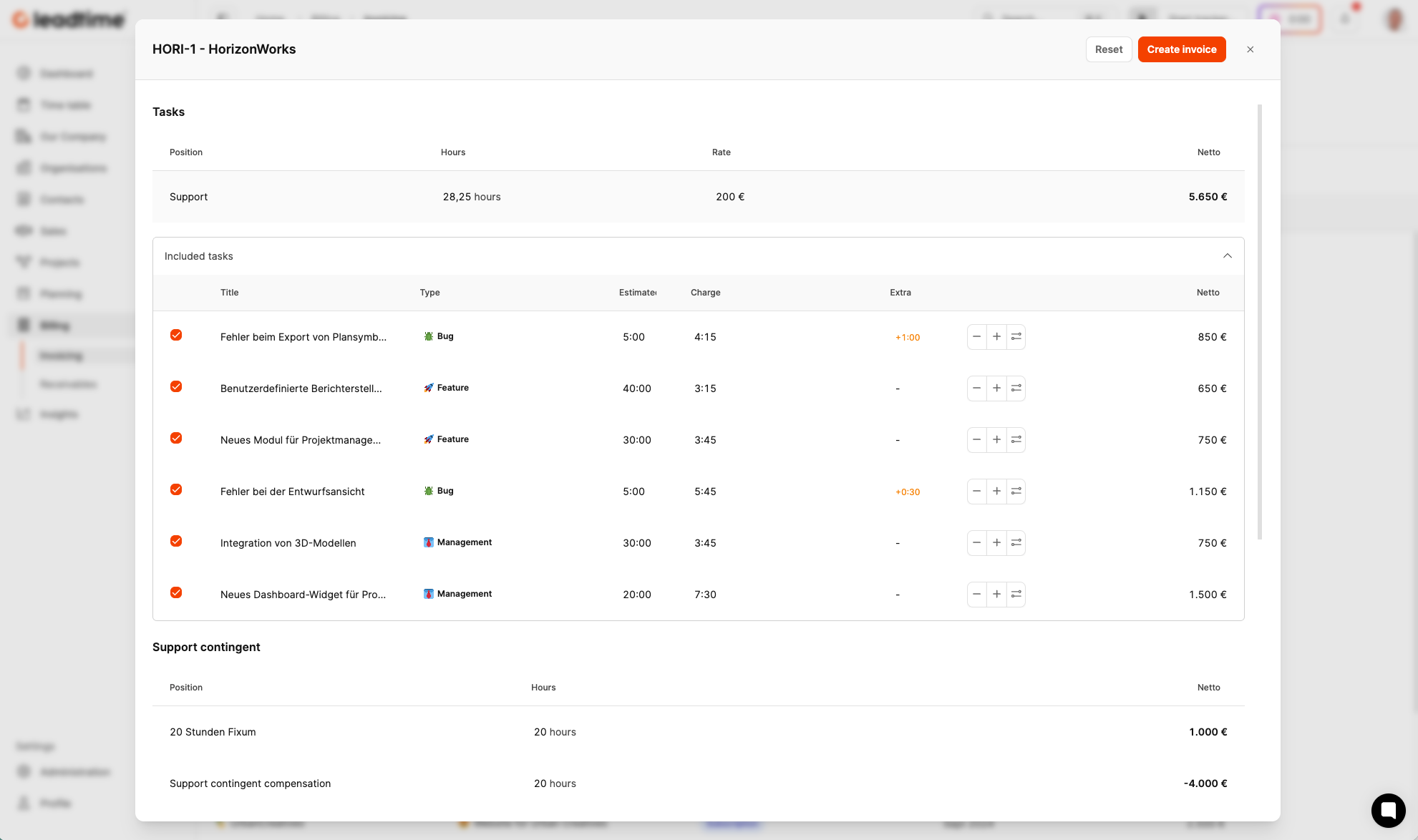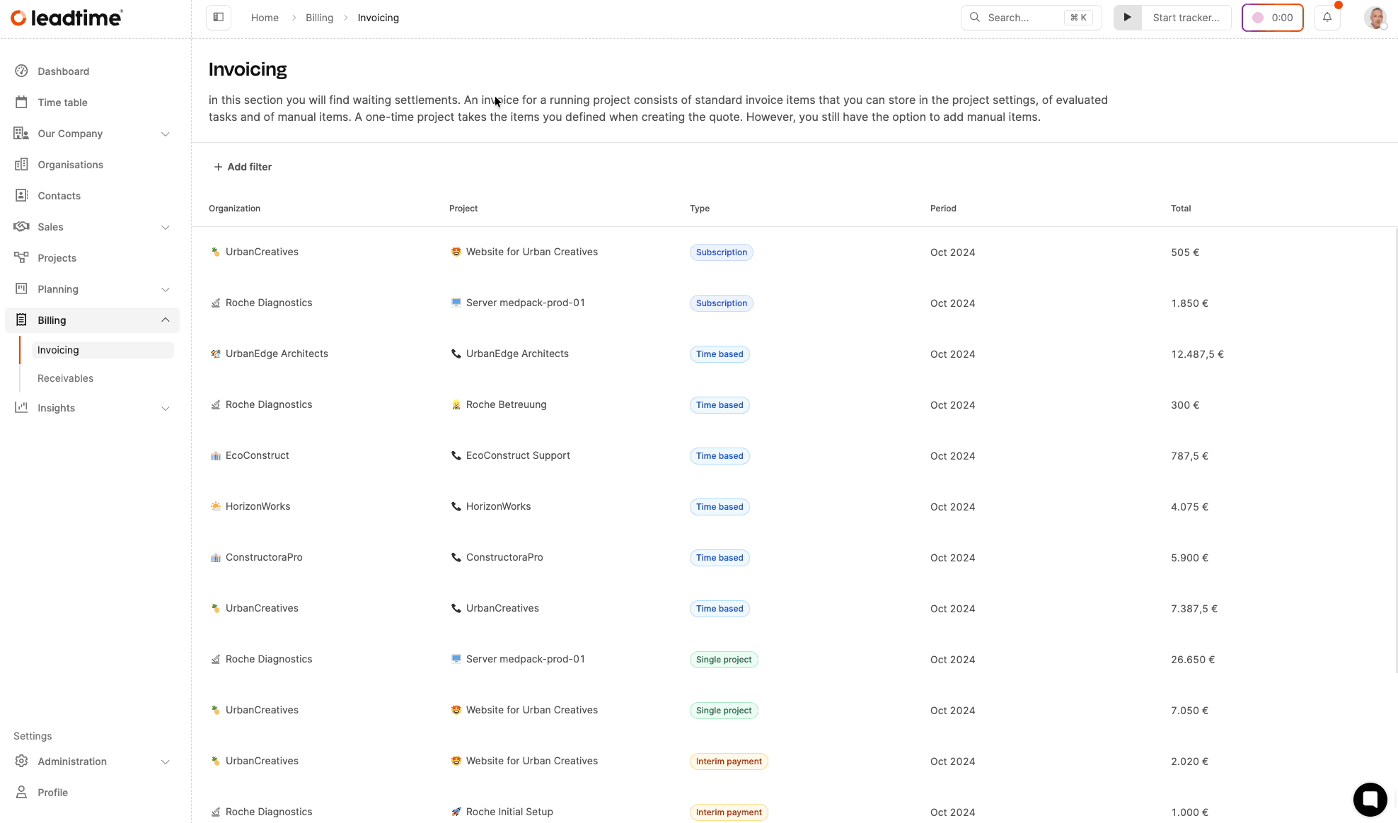 Leadtime organizes projects and tasks in a clearly defined data structure. The billing system uses this structure to bill services automatically and accurately.