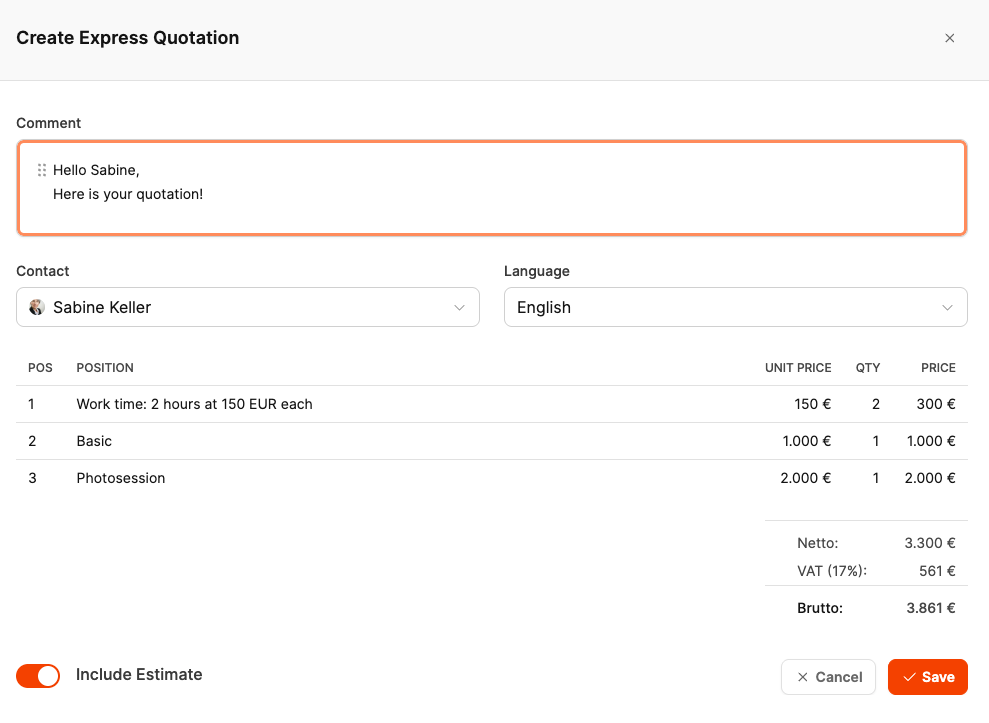 Express offers let you handle smaller customer requests straight from a ticket with a clearly defined price. Once the customer accepts, they show up automatically in the invoice check and can be billed there.