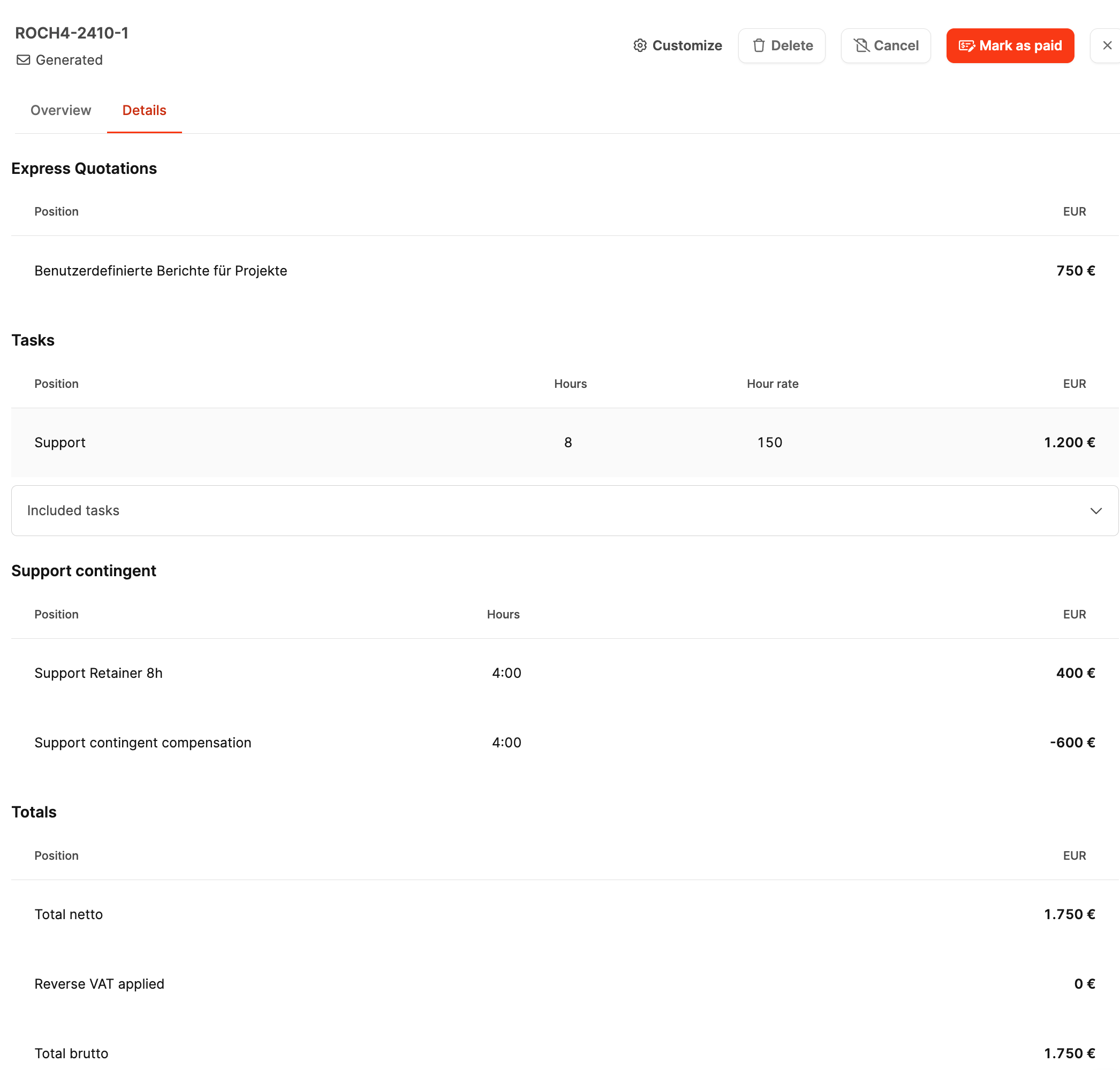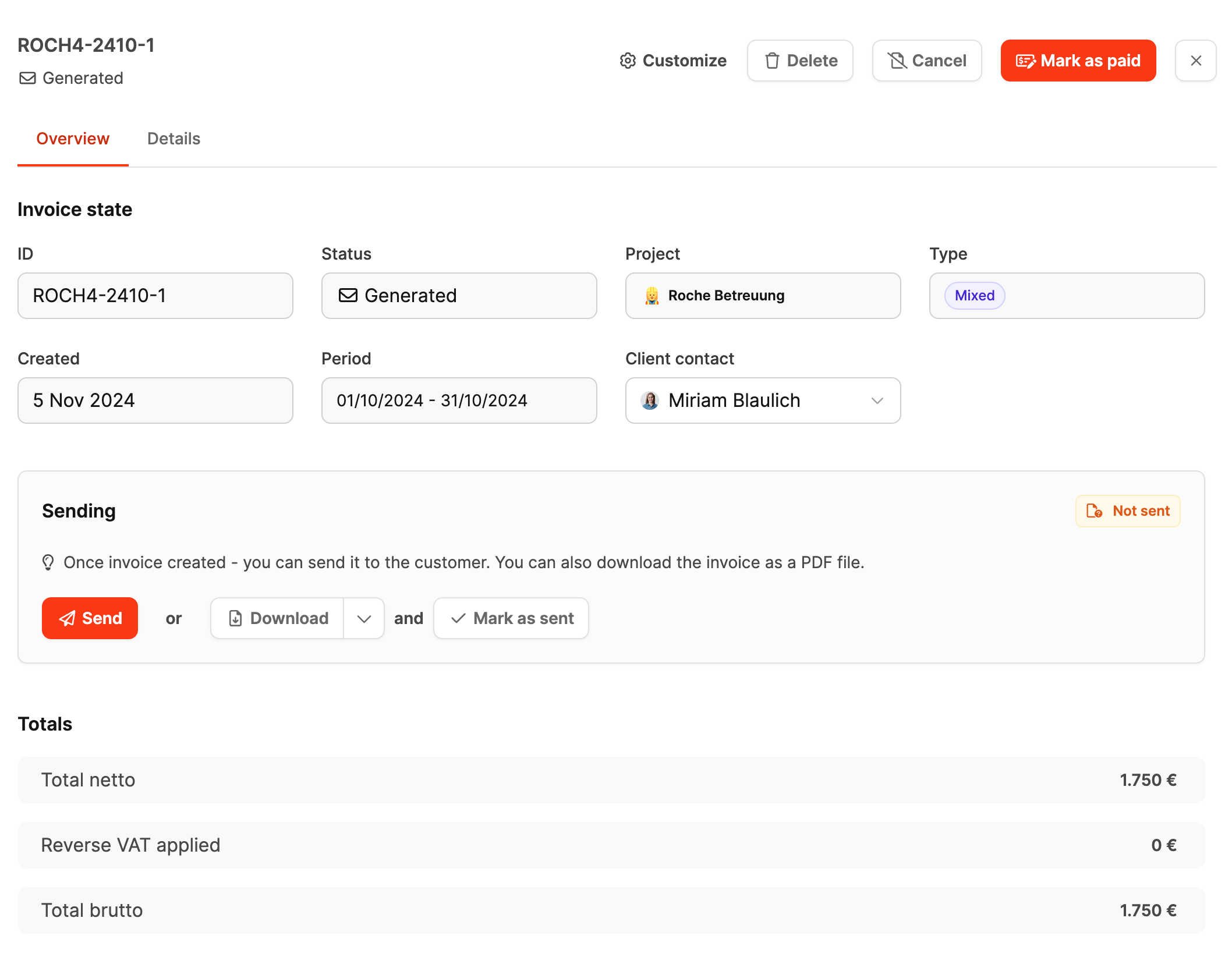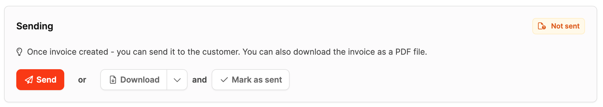 Mark as paid – moves the invoice to the tab “Paid” after payment is received.