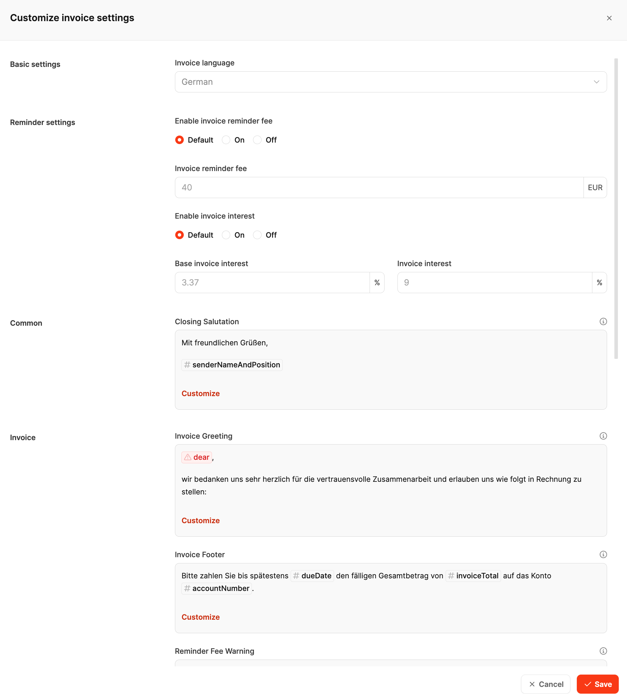 Invoice | Invoice greeting | Free text incl. placeholders (intro for the invoice) |