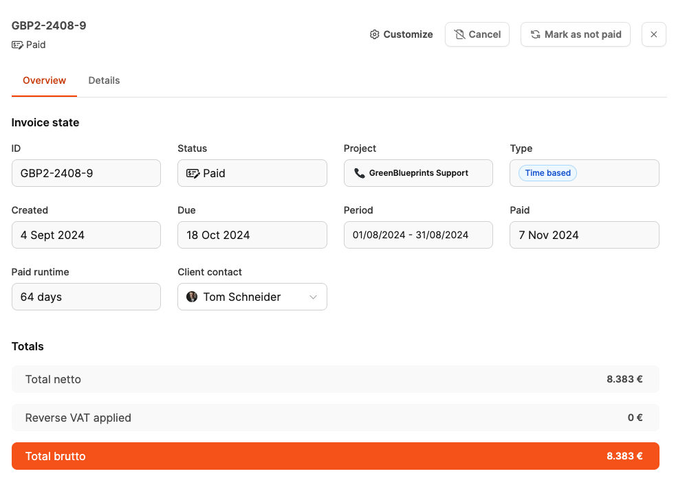 The “Paid” tab in the Invoices area shows all invoices that have already been fully settled. You can find it under Billing → Invoices → Paid. This area is for tracking completed invoices and lets you keep a clear overview of payment history. You can't edit invoice items here anymore.