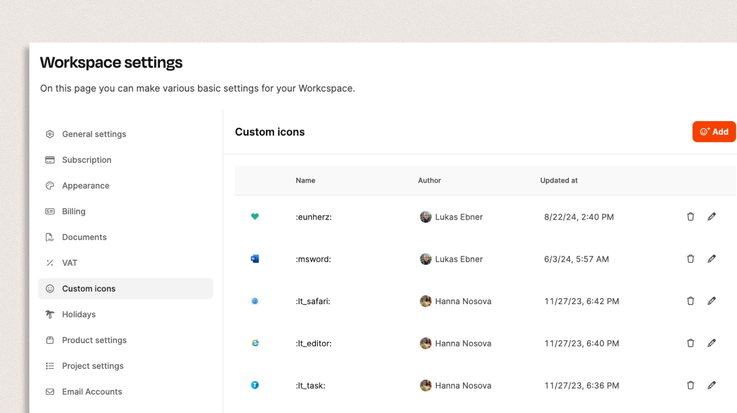 In this section, you can upload your own icons for your workspace. This feature helps you organize information visually and makes content easier to grasp quickly.