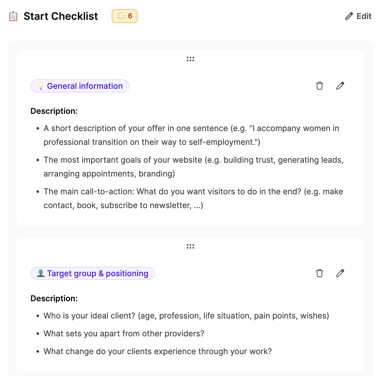 The OnePage Website component is split into several main Epics, which represent key phases in the project's progress. Inside each Epic, you'll find work packages, checklists, and optional service sections. Altogether, there are over 40 structured steps, all clearly defining the project's path.