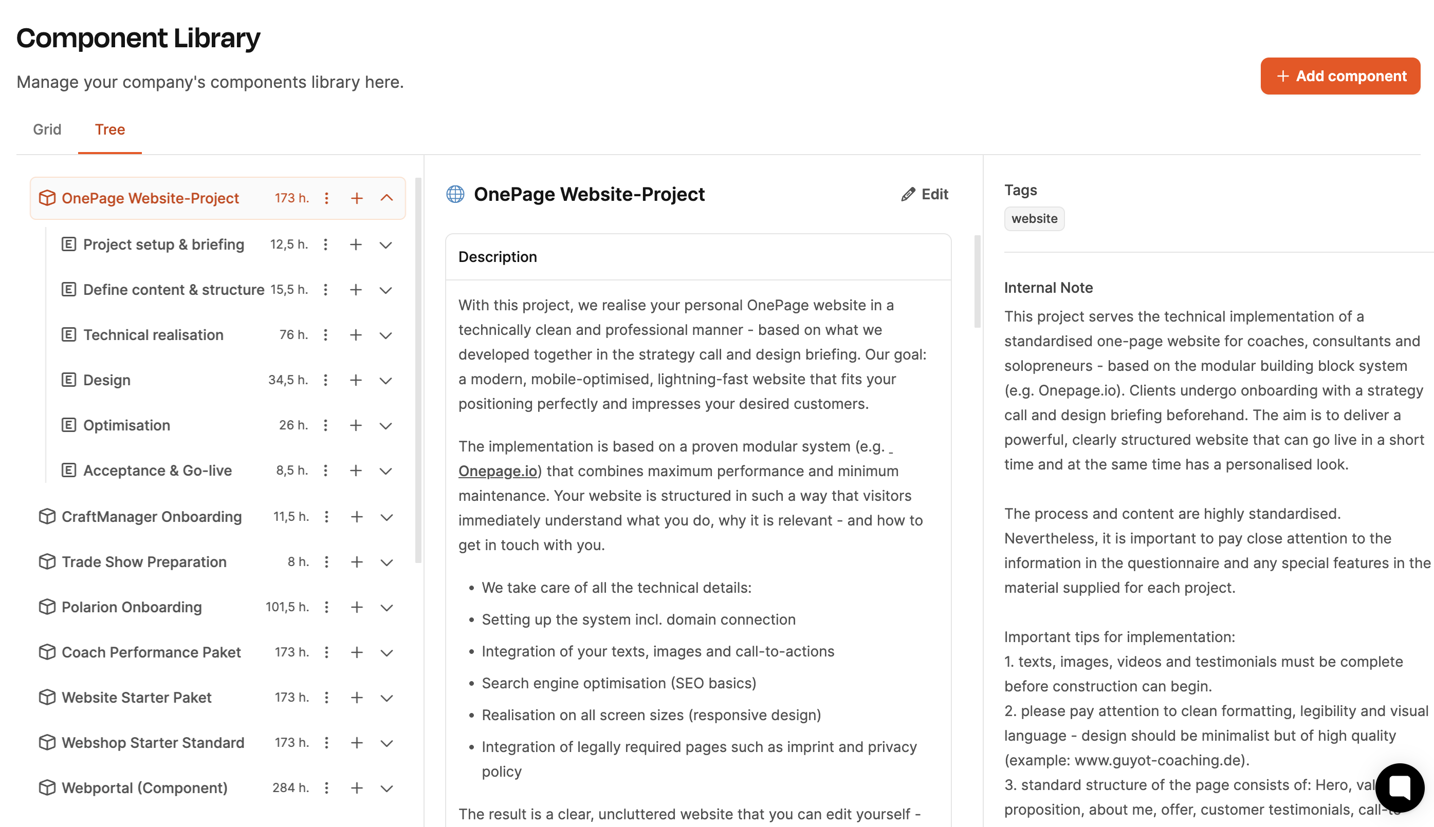 The project component OnePage Website forms the content and technical foundation for standardized website projects. It's set up centrally in Leadtime once and then reused as often as needed. Through structured questions, conditions, and optional feature blocks, every project can be configured individually—without changing processes, quality, or costing. The component is used as the basis for offer calculation, effort estimation, ticket generation, and later processing.