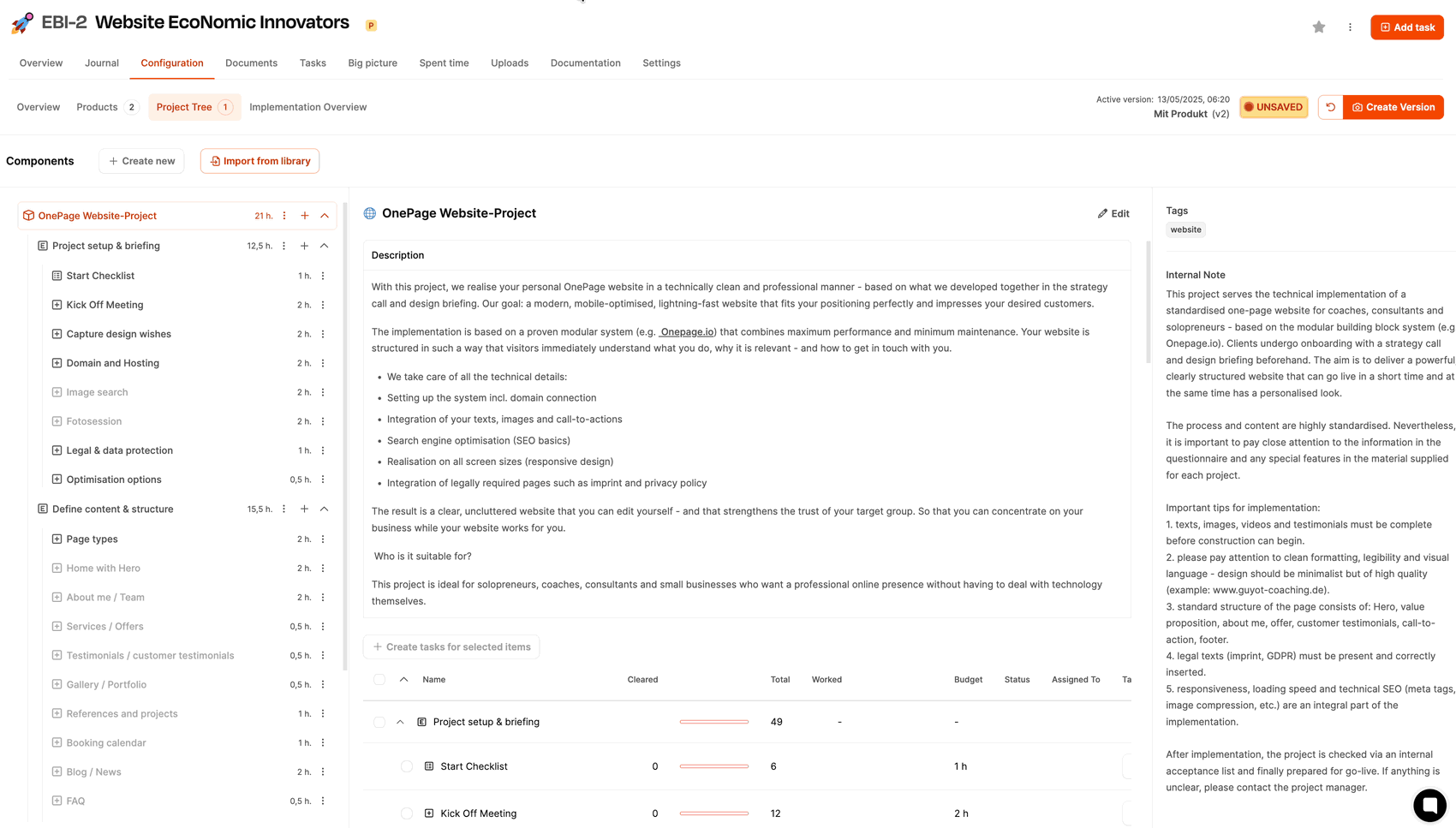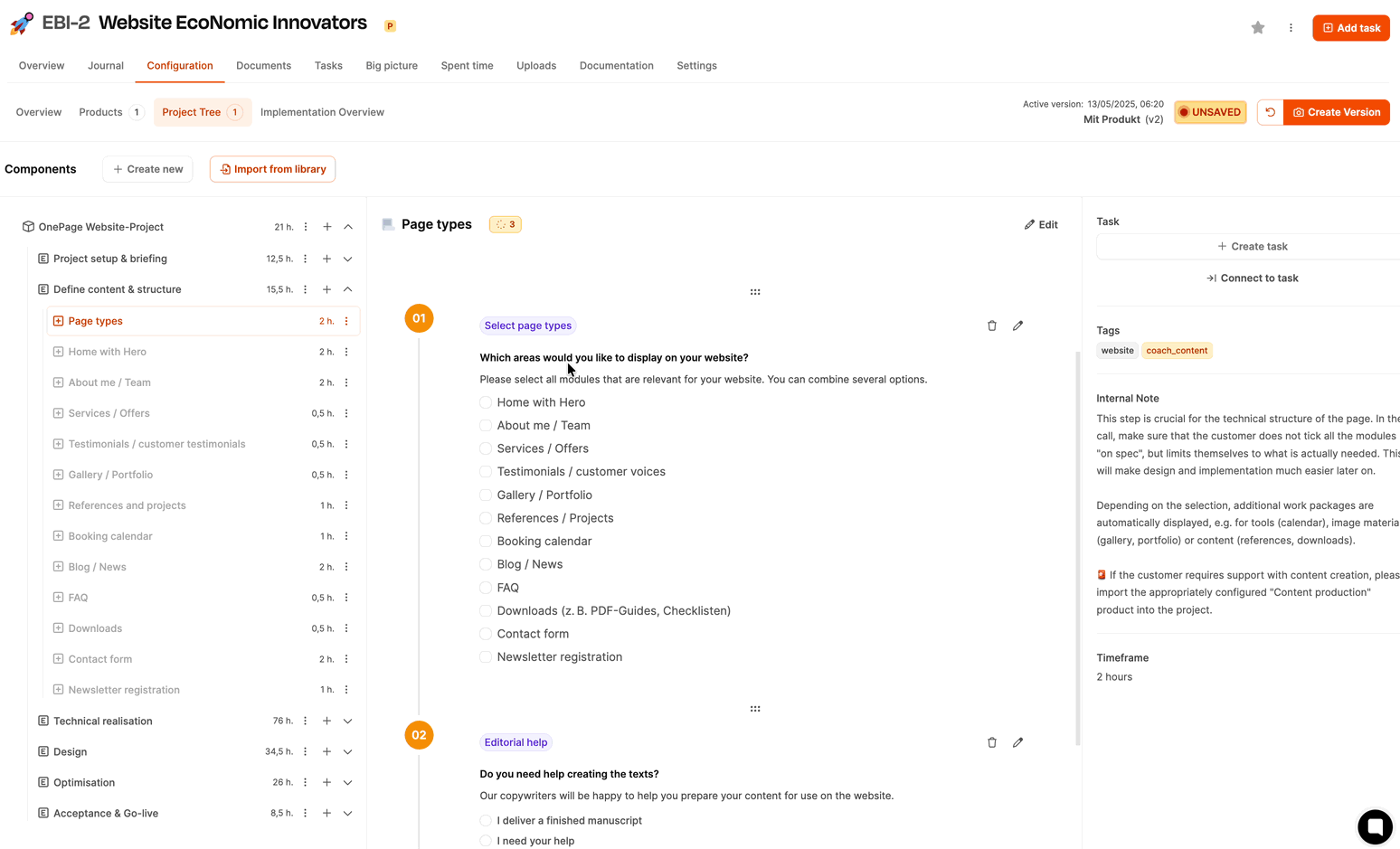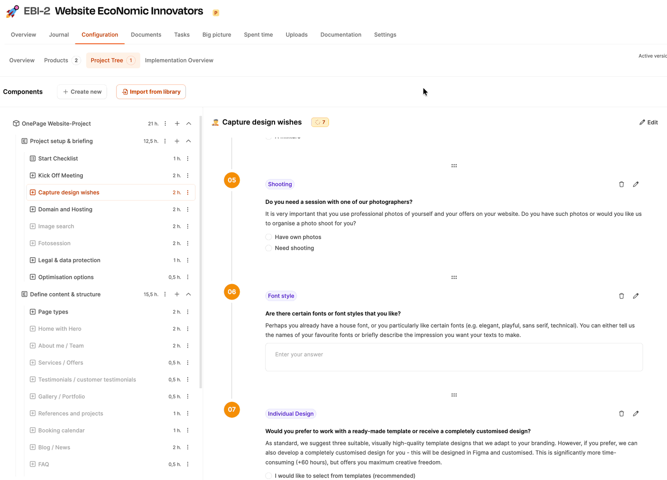This question is set up as a multiple choice (checkboxes). Depending on which answer options are selected, additional, previously hidden work packages are automatically added to the project. For example, if the customer picks “Gallery / Portfolio”, a matching work package pops up immediately with time estimation, a description and an internal note.