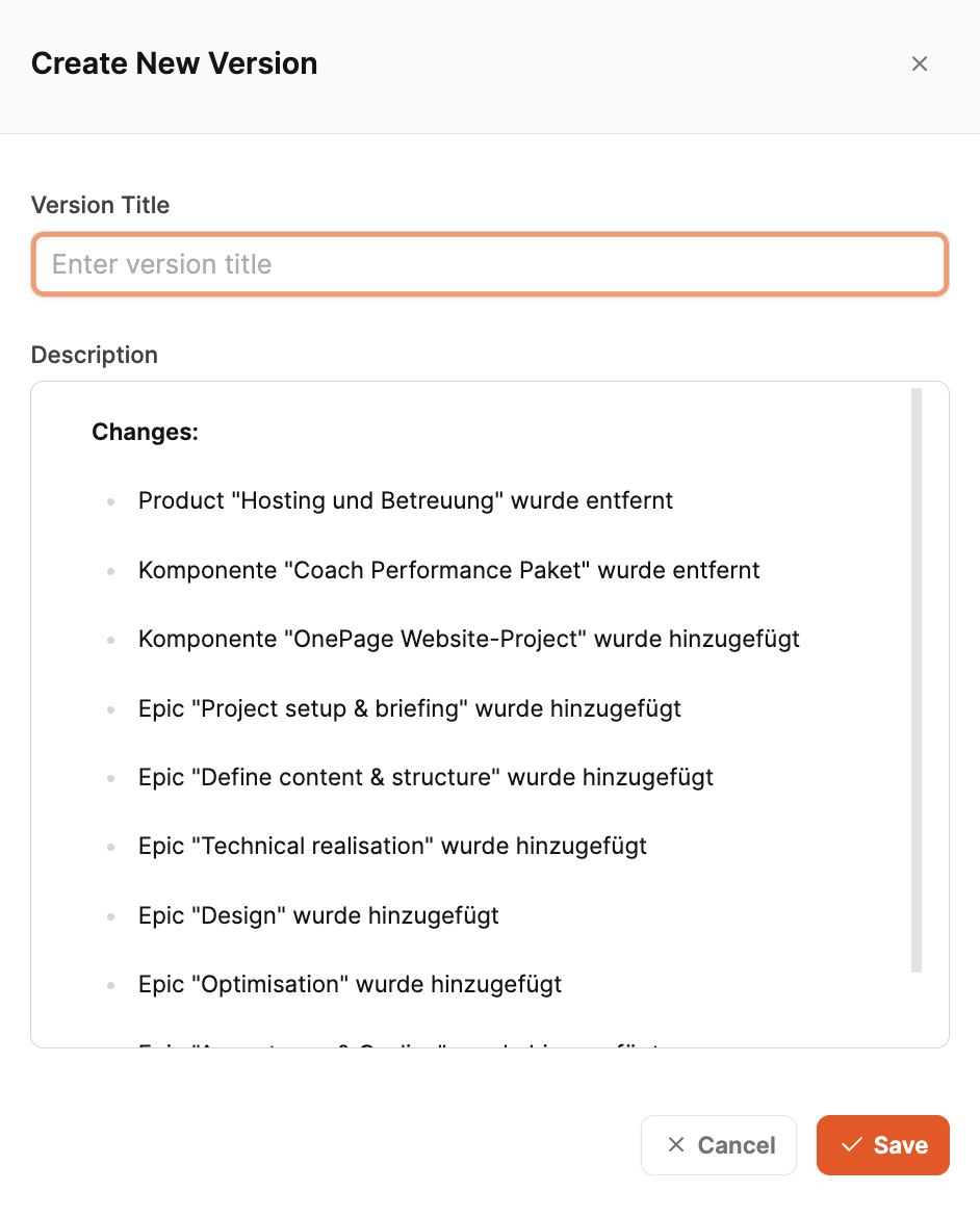 When you click Save, the version is created. The “Not saved” notice disappears and the current version is shown up top, including a timestamp. From now on, all documents relevant to the offer can clearly reference this version – so it basically serves as the fixed starting point for all further communication with the customer.