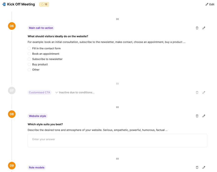 Once the checklist is done, the agency usually has a strategy session with every new client. For that, the agency has prepared a dedicated work package with a built-in questionnaire in the project component design. The project team fills it out during the conversation.