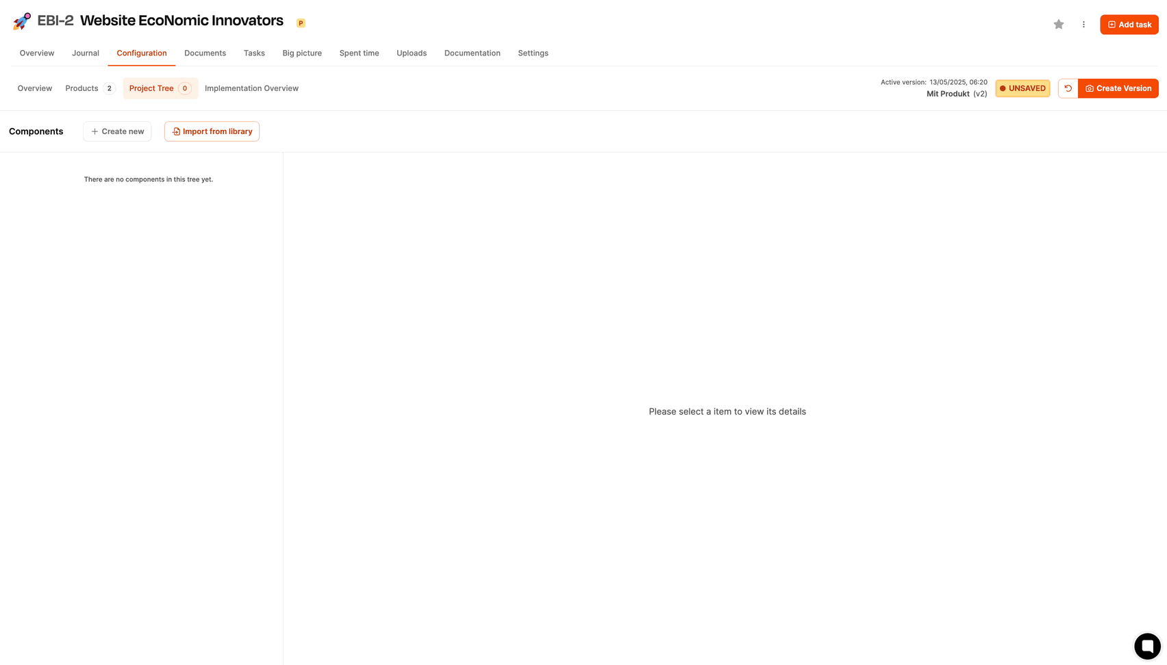 Once you open the Project tree tab, the view is initially empty. Through Import from catalog you can choose a prepared component from the components library, e.g. OnePage website. The selected component will then be shown, including epics, work packages, and forms. You can also combine multiple components.