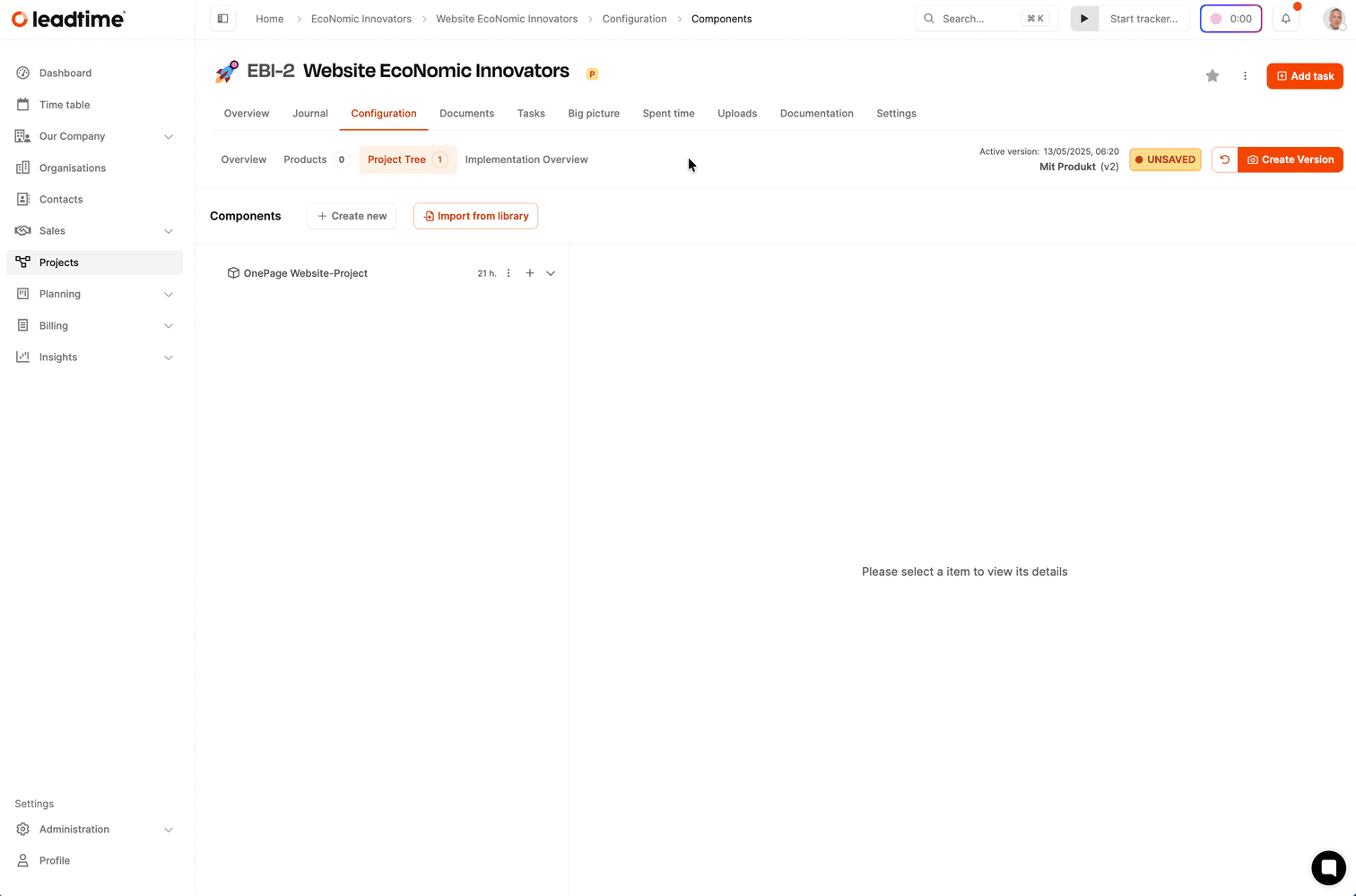 As soon as a project in Leadtime has its first contents — like components, tasks, answered questions, or added products — it’s time for your first version. Versions are essential to create project-based documents like quotes or requirement specs. These documents will always reference a specific, saved project version.