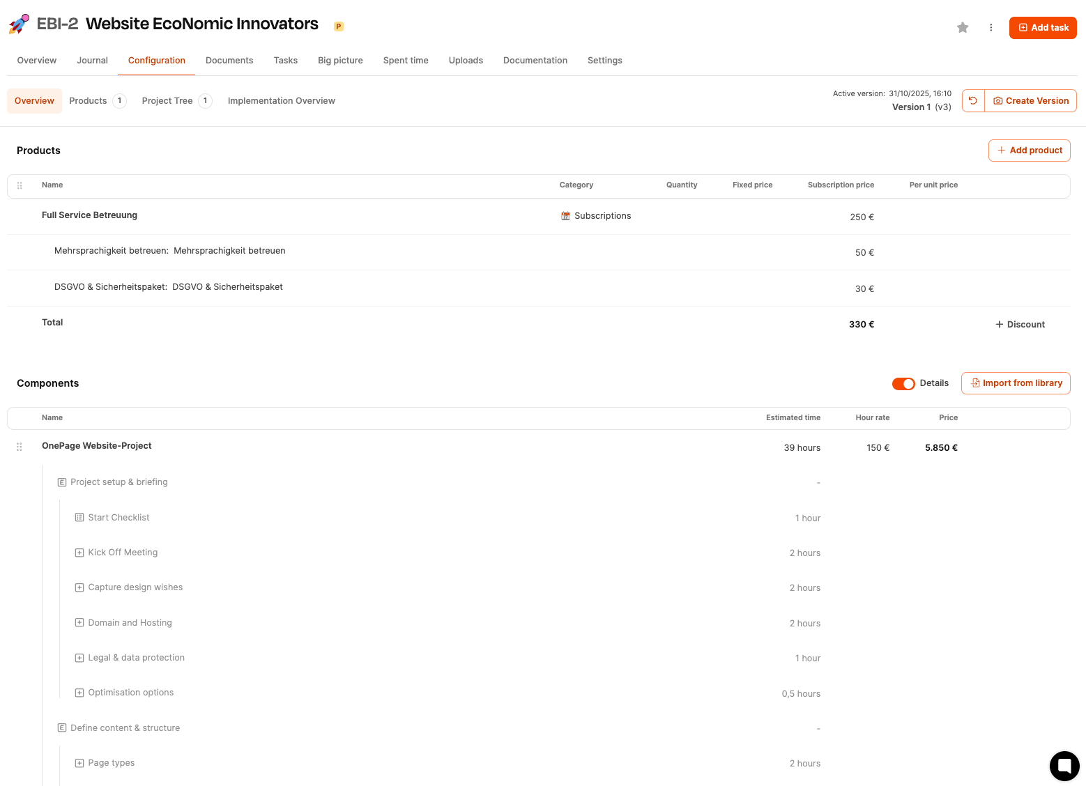 Selected variants and options automatically update the stored price. The product then appears as a separate block in the project's offer overview.