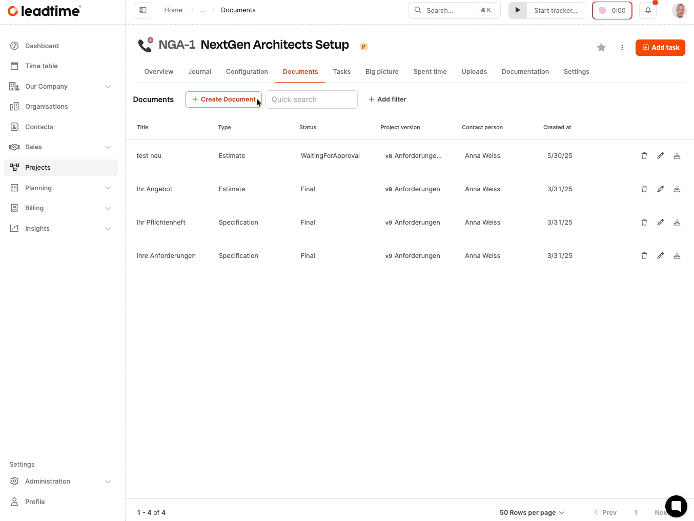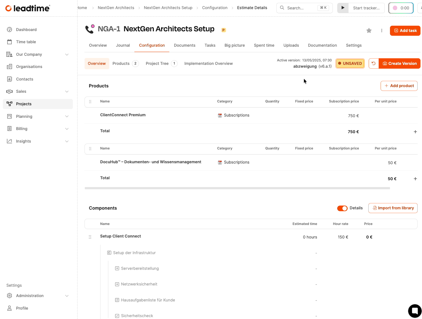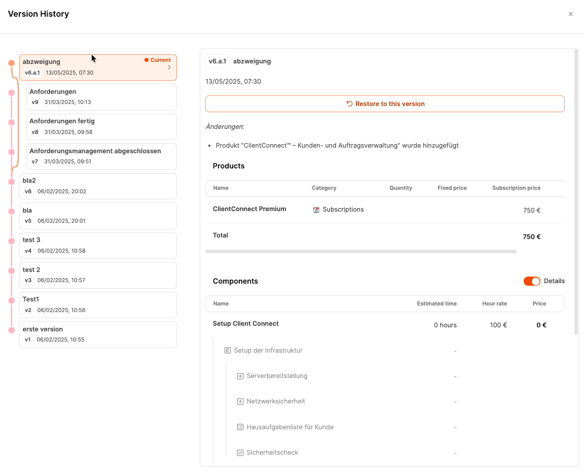 Version management freezes the current state of a project and makes sure that offered, negotiated, and contracted content always remains clearly traceable. Versions reliably document which services have been sold and serve as the basis for quotes, specifications, and later billing.