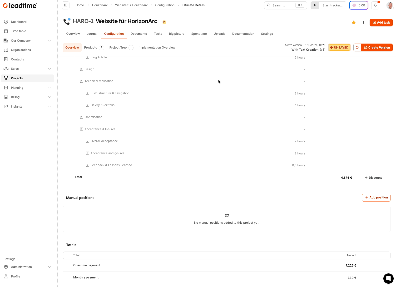 Not every customer offer can be put together entirely from products and components. Especially when it comes down to the final round of creating an offer, individual requests often show up – extra services, special discounts, or costs that aren't standard in the catalog. In Leadtime, these cases can be handled easily with manual items and discounts.