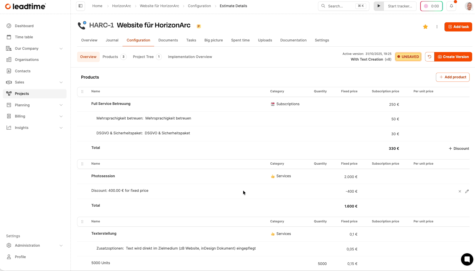 After making changes, you should create a new version. To do this, in the Configuration area, click Create version, give it a title, and save. Changes are logged automatically. Offer documents are always based only on saved versions.